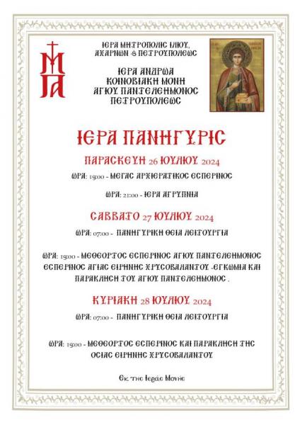 Η Ιερά Ανδρώα Κοινοβιακή Μονή Αγίου Παντελεήμονος Πετρουπόλεως ανακοινώνει στους ευσεβείς πιστούς το πρόγραμμα της πανηγύρεως της ιεράς μνήμης του εφόρου της Αγίου: