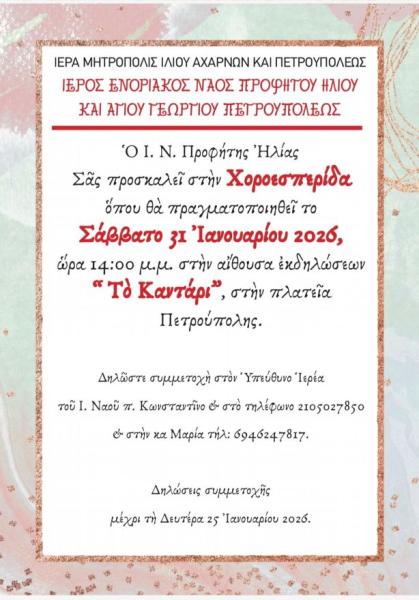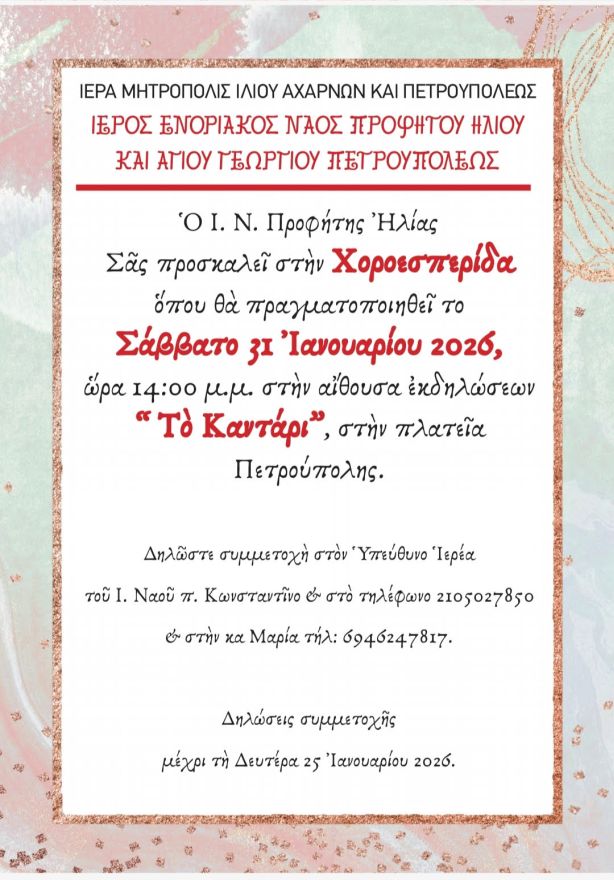 Ἡ Ἐνορία Προφήτου Ἠλιοῦ Πετρουπόλεως διοργανώνει Χοροεσπερίδα τὸ Σάββατο 31 Ἰανουαρίου 2026 καὶ ὥρα 14:00, στὴν αἴθουσα ἐκδηλώσεων «Καντάρι», στὴν πλατεῖα της Πετρούπολης.