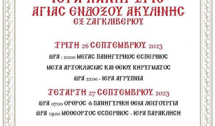 Η Ιερά ανδρώα κοινοβιακή Μονή Αγίου Παντελεήμονος Πετρουπόλεως θα εορτάσει πανηγυρικά τη μνήμη της Αγίας Ακυλίνης εκ Ζαγκλιβερίου κατά το ακόλουθο πρόγραμμα: