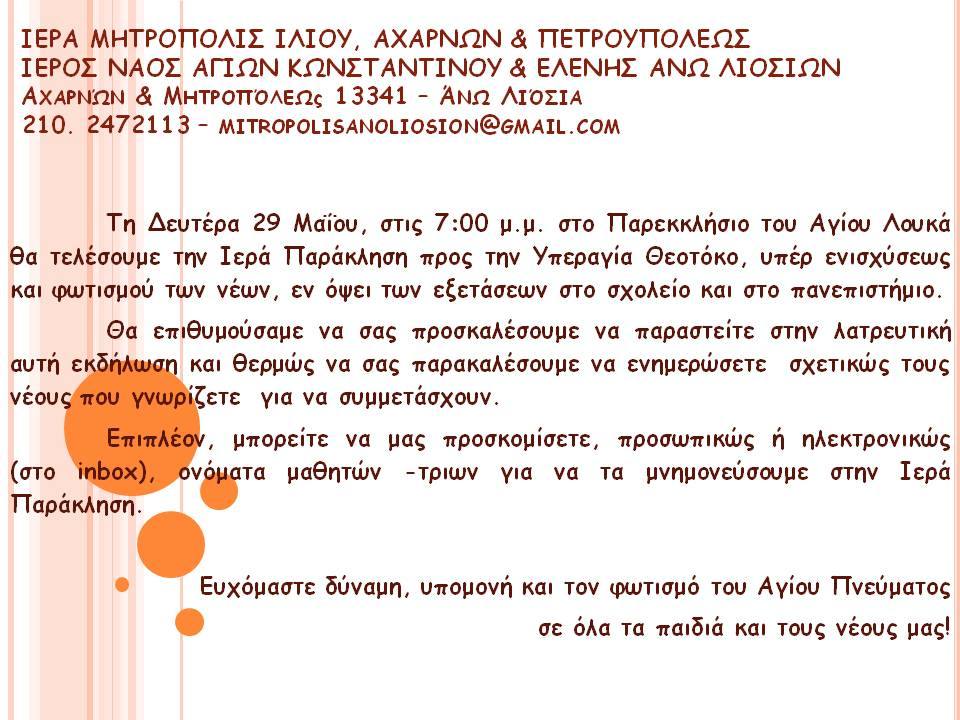 Τη Δευτέρα 29 Μαΐου 2023, στις 7 μ.μ., στο Παρεκκλήσιο του Αγίου Λουκά Αρχιεπισκόπου Συμφερουπόλεως στα Άνω Λιόσια, θα τελέσουμε την Ιερά Παράκληση προς την Υπεραγία Θεοτόκο, υπέρ ενισχύσεως και φωτισμού των νέων, εν όψει των εξετάσεων στο σχολείο και στο πανεπιστήμιο.