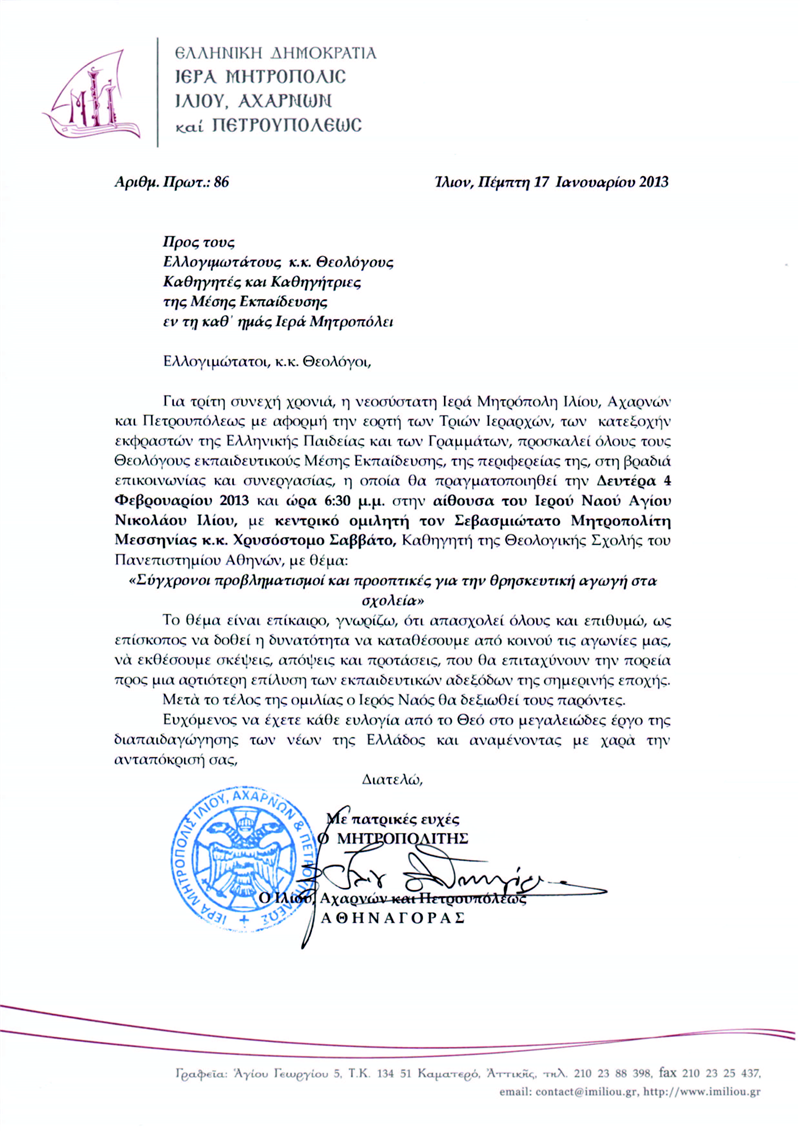 Πρόσκληση από τον Μητροπολίτη Ιλίου κ. Αθηναγόρα προς όλους τους καθηγητές Θεολογίας των περιφερειών της Ιεράς Μητροπόλεως.