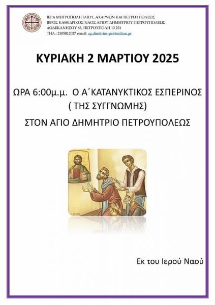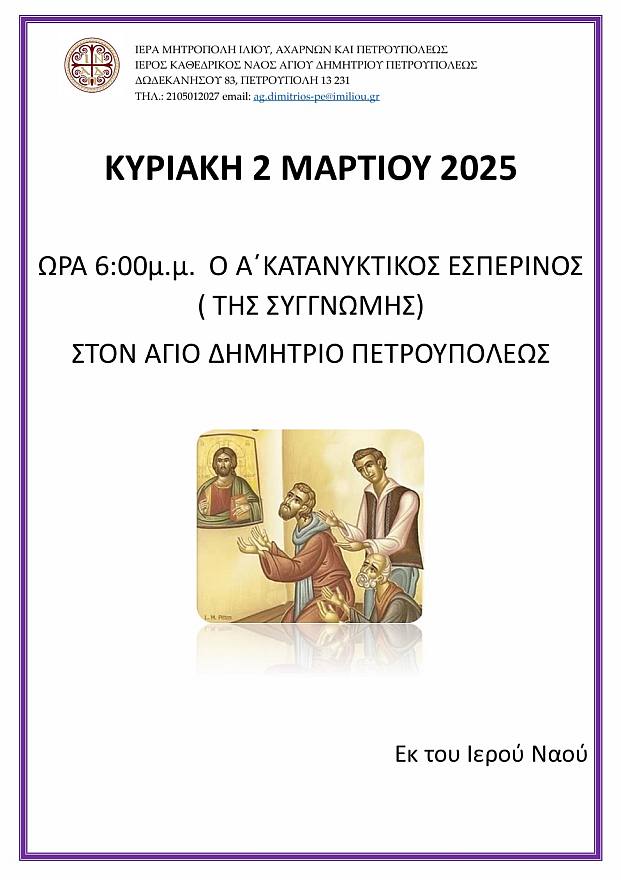 Ο Α' Κατανυκτικός Εσπερινός (της συγγνώμης) θα τελεστεί στον Άγιο Δημήτριο Πετρουπόλεως την Κυριακή 2 Μαρτίου 2025 στις 18:00.