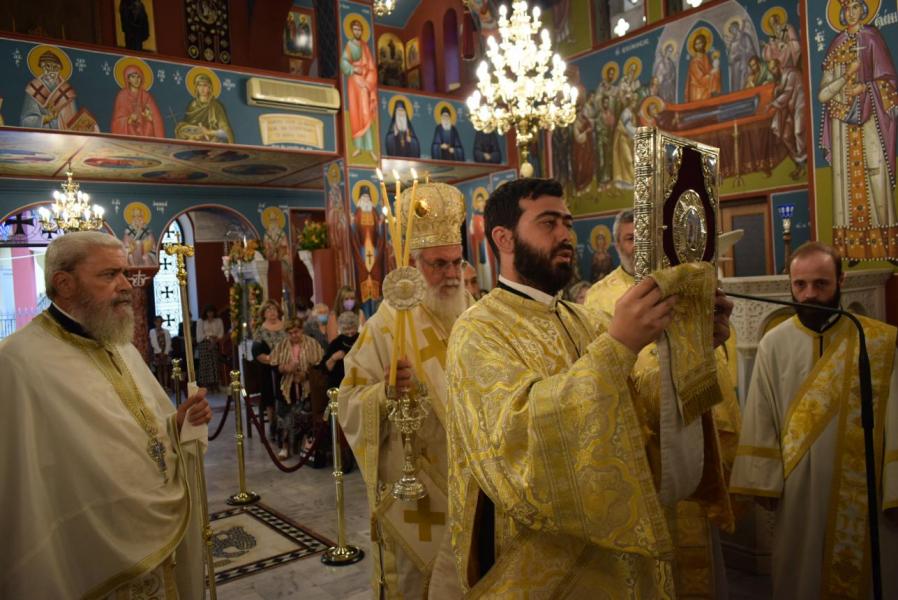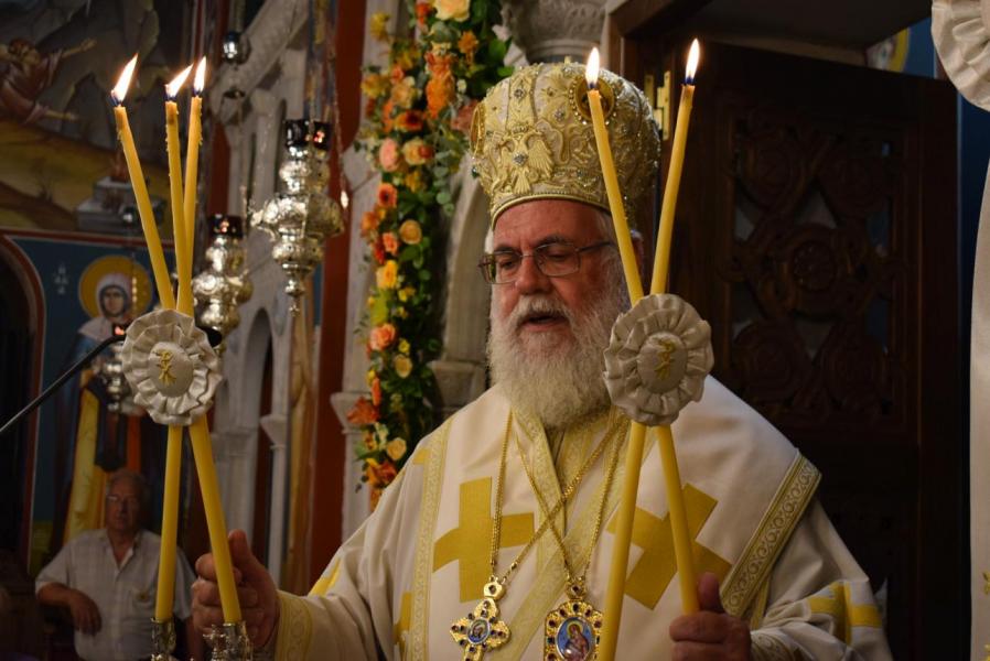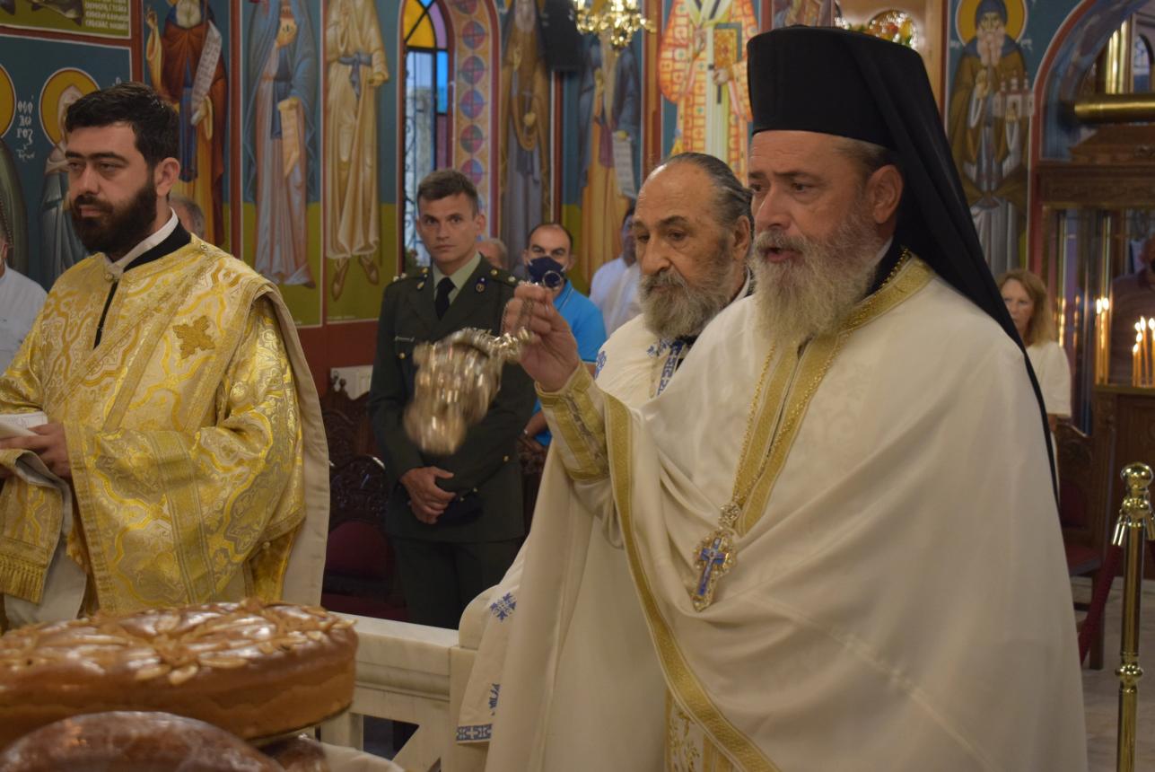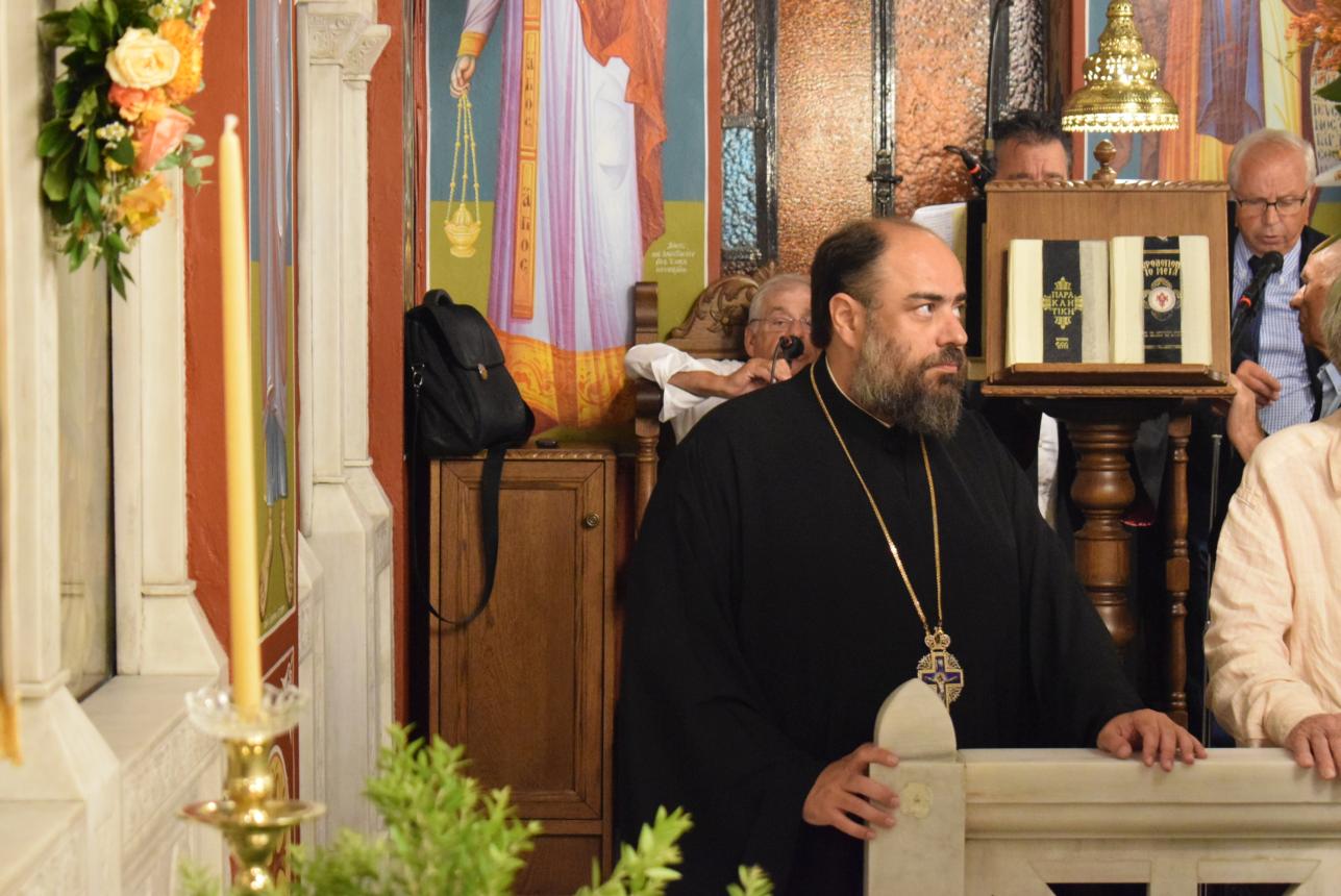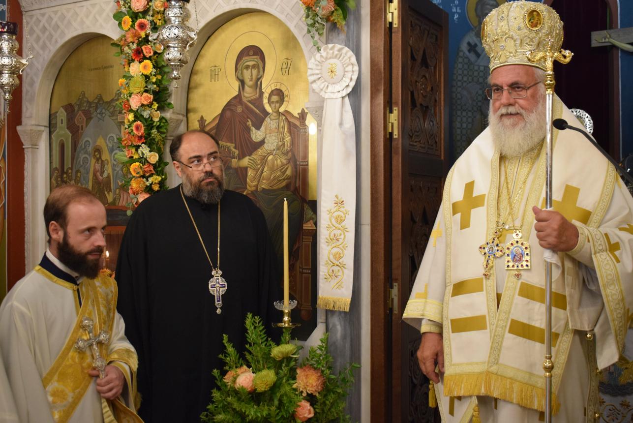 Στο τέλος της Θείας Λειτουργίας ο Σεβασμιώτατος αναφέρθηκε στο γεγονός της εορτής της Κοιμήσεως της Θεοτόκου, ερμηνεύοντας τον στίχο «τὴν ζωὴν ἡ κυήσασα, πρὸς ζωὴν μεταβέβηκας» από τροπάριο του Όρθρου. Η Παναγία κατέστη δοχείο ζωής, χώρα του Αχωρήτου, με τη σύλληψη και τη γέννηση του Θεανθρώπου Χριστού, ο οποίος είναι «η οδός, η αλήθεια και η ζωή». Εκείνος δίνει ζωή και ύπαρξη σε κάθε τι στο σύμπαν και με τη σάρκωσή του ζωοποιεί τον άνθρωπο, προσφέροντάς του τη δυνατότητα κατάκτησης της αθανασίας, την οποία έχασε στον Παράδεισο.