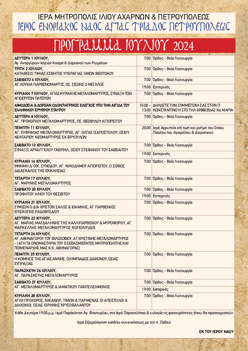 Λατρευτικό Πρόγραμμα της Ενορίας Αγίας Τριάδος Πετρουπόλεως μηνός Ιουλίου 2024