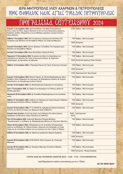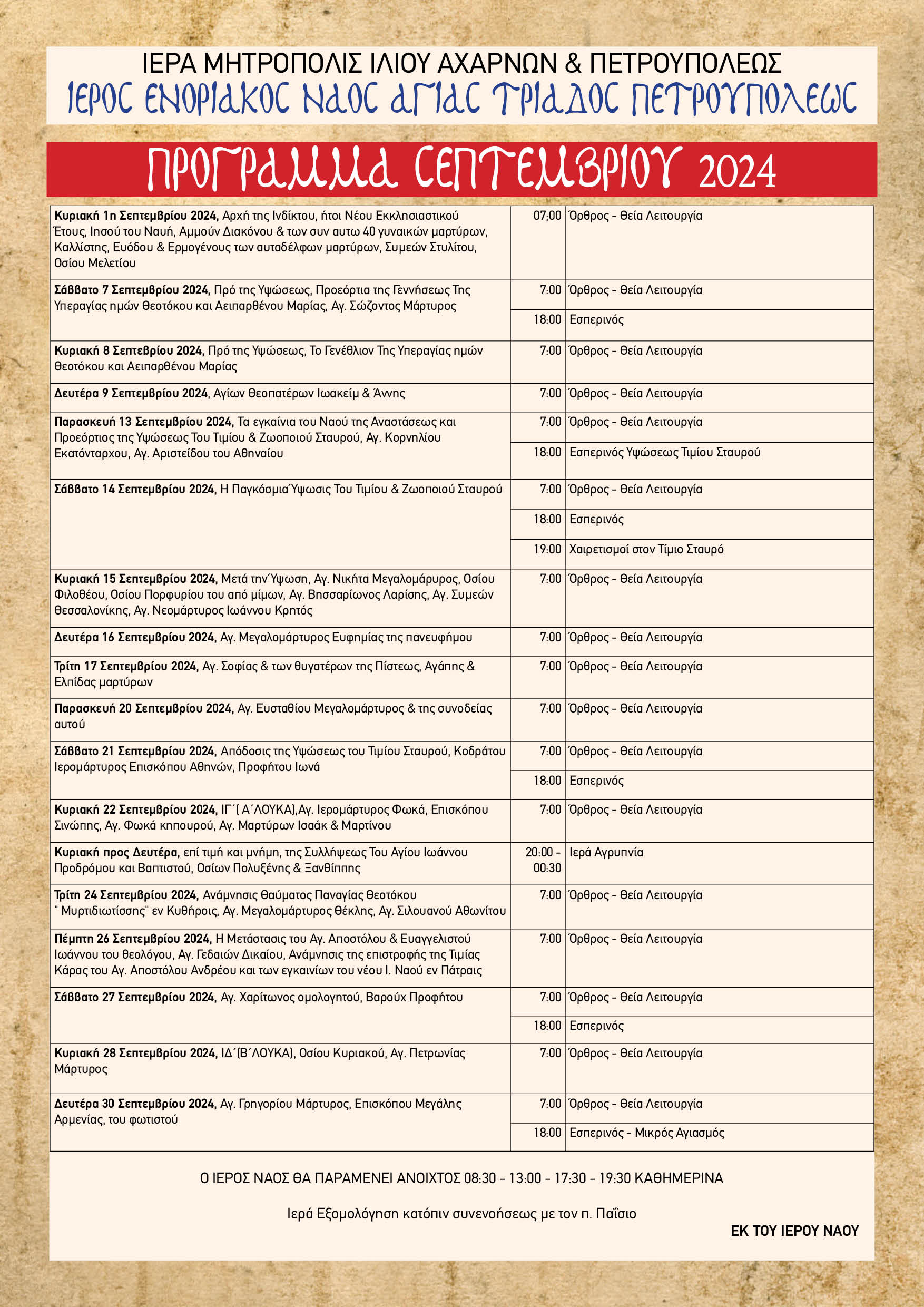 Λατρευτικό Πρόγραμμα της Ενορίας Αγίας Τριάδος Πετρουπόλεως μηνός Σεπτεμβρίου 2024
