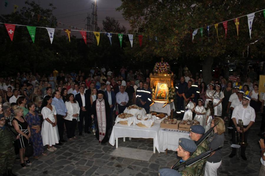 Μετά την λιτάνευση της ιεράς εικόνος του αγίου, την οποία εβάσταζαν τιμητικά ομάδα εθελοντών πυρασβεστών συνοδευόμενοι από άγημα σμηνιτών και μικρή ομάδα μυροφόρων κοριτσιών, επηκολούθησε η ακολουθία της ευλογίας των άρτων.