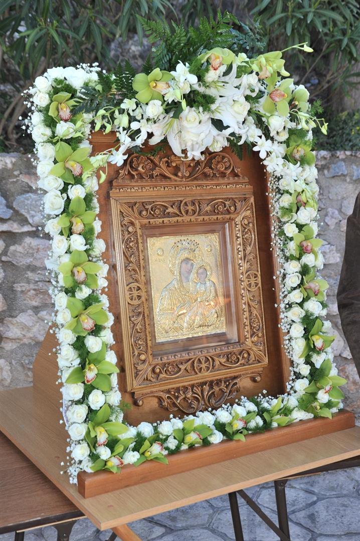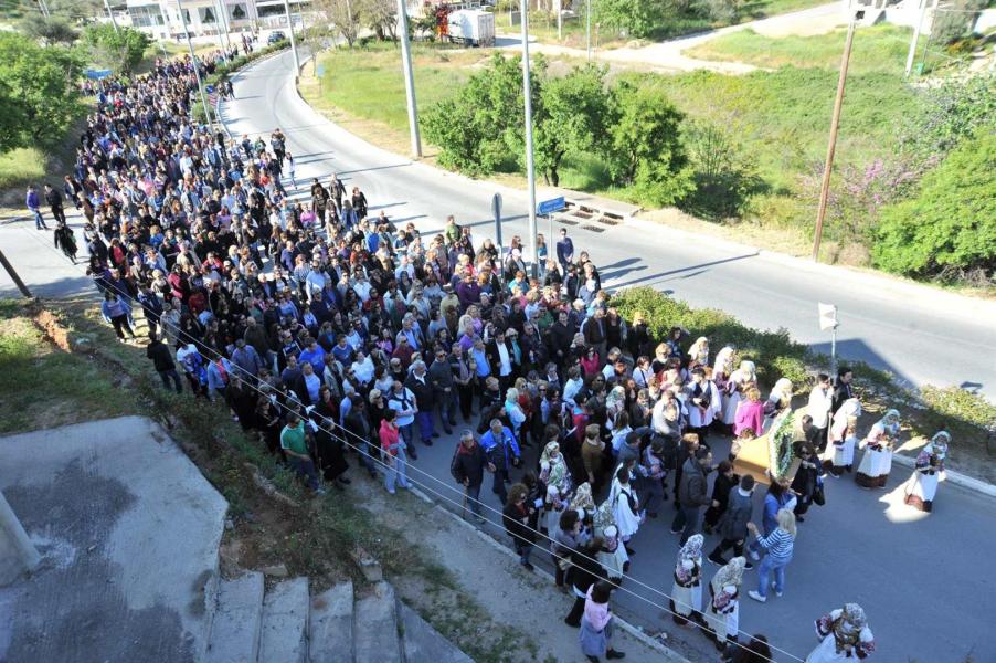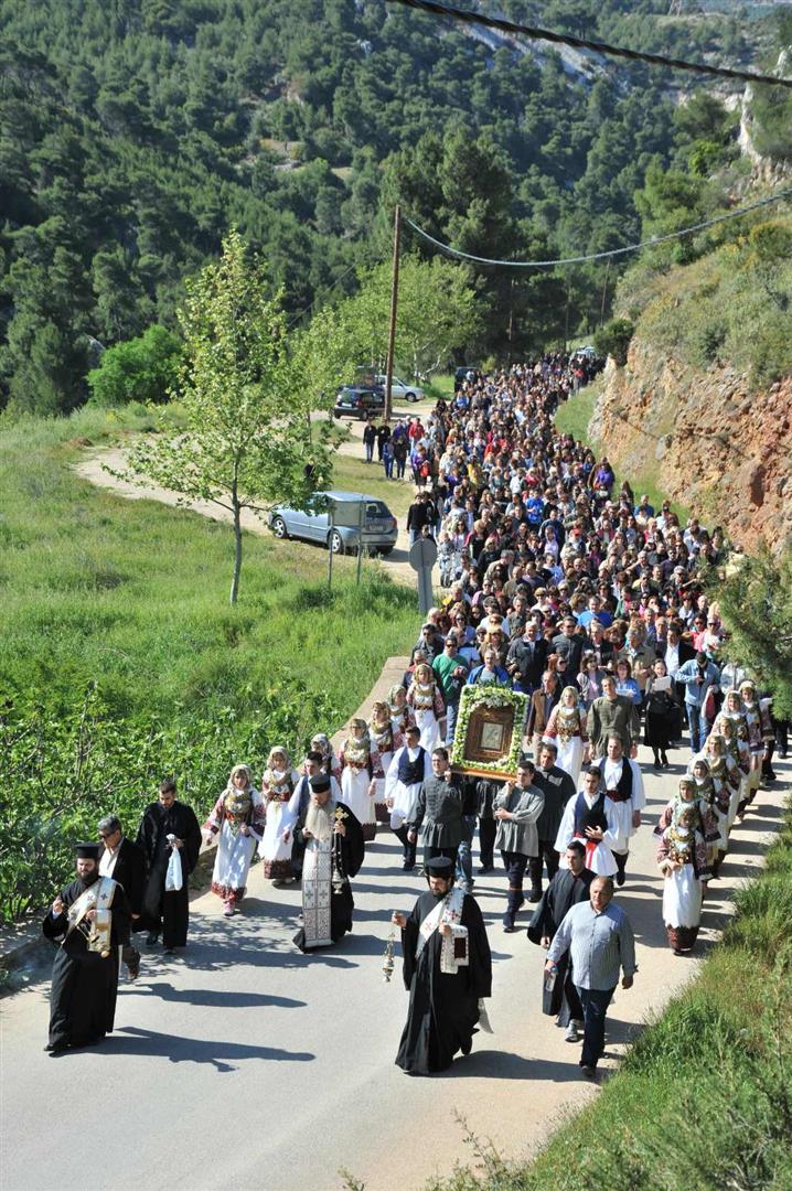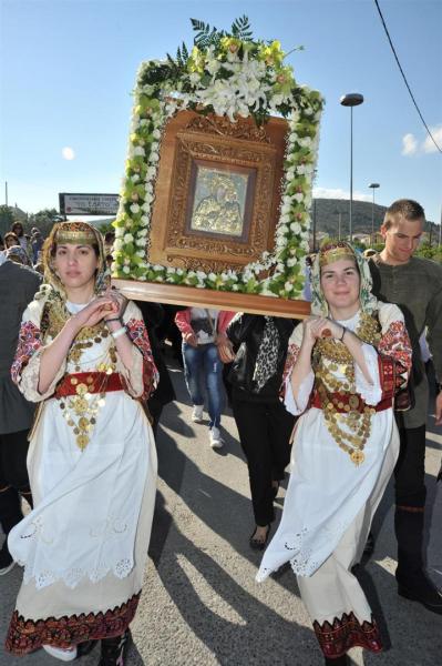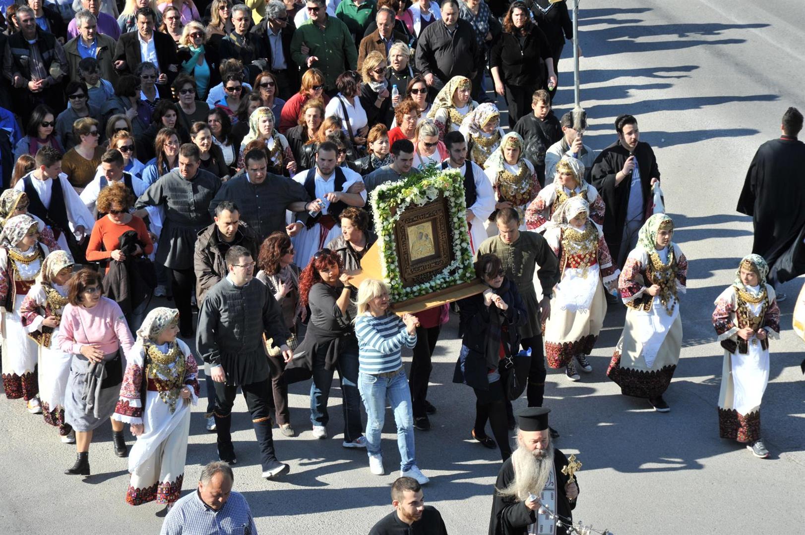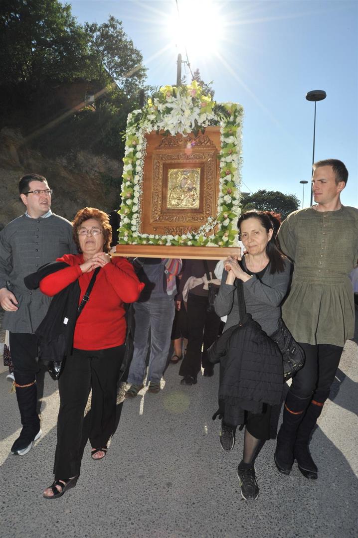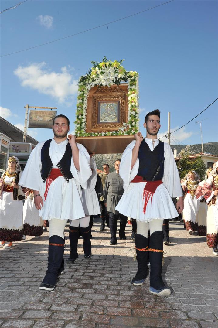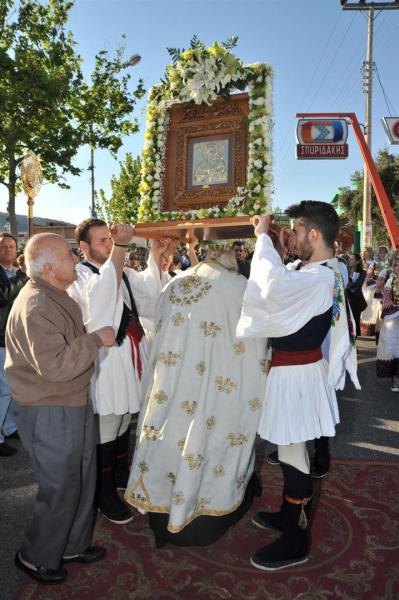 Πολλοί ήταν εκείνοι - άνδρες και γυναίκες - που μετέφεραν την εικόνα στους ώμους τους κατά τη διάρκεια της δίωρης πορείας. Το γιορτινό χρώμα, βεβαίως, έδωσαν τα παιδιά του πολιτιστικού συλλόγου «η Γρίζα» με τις τοπικές ενδυμασίες.