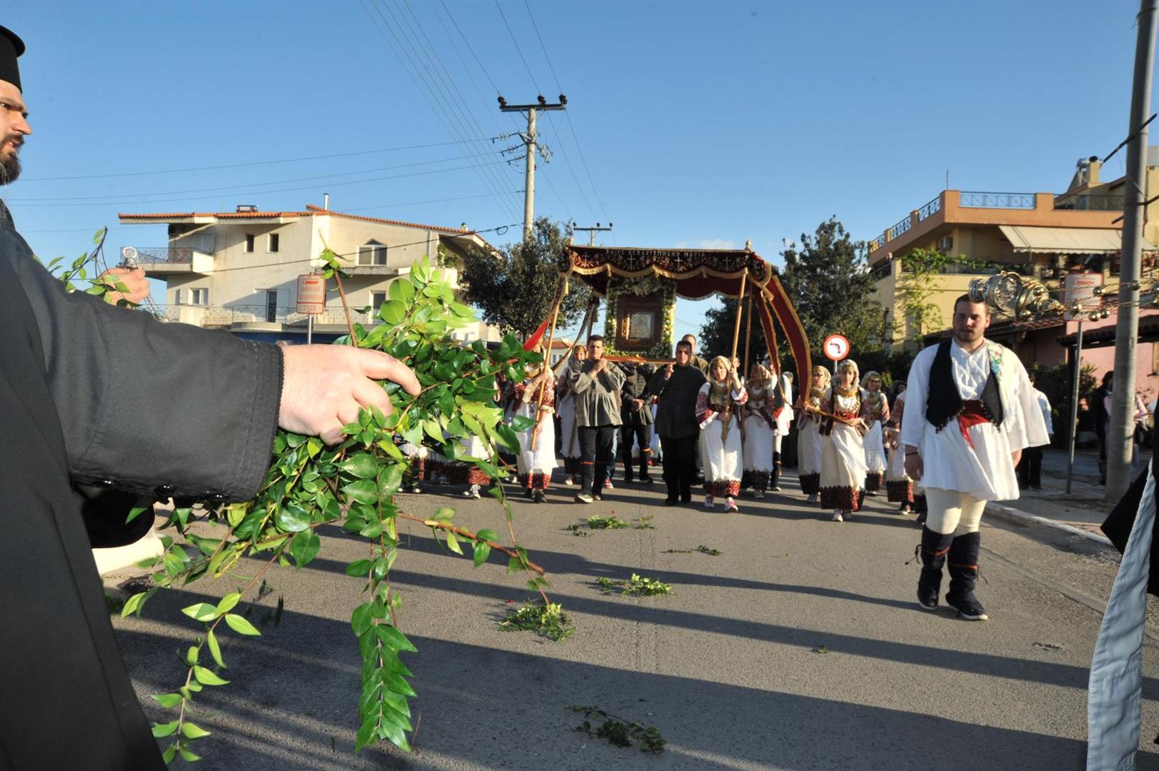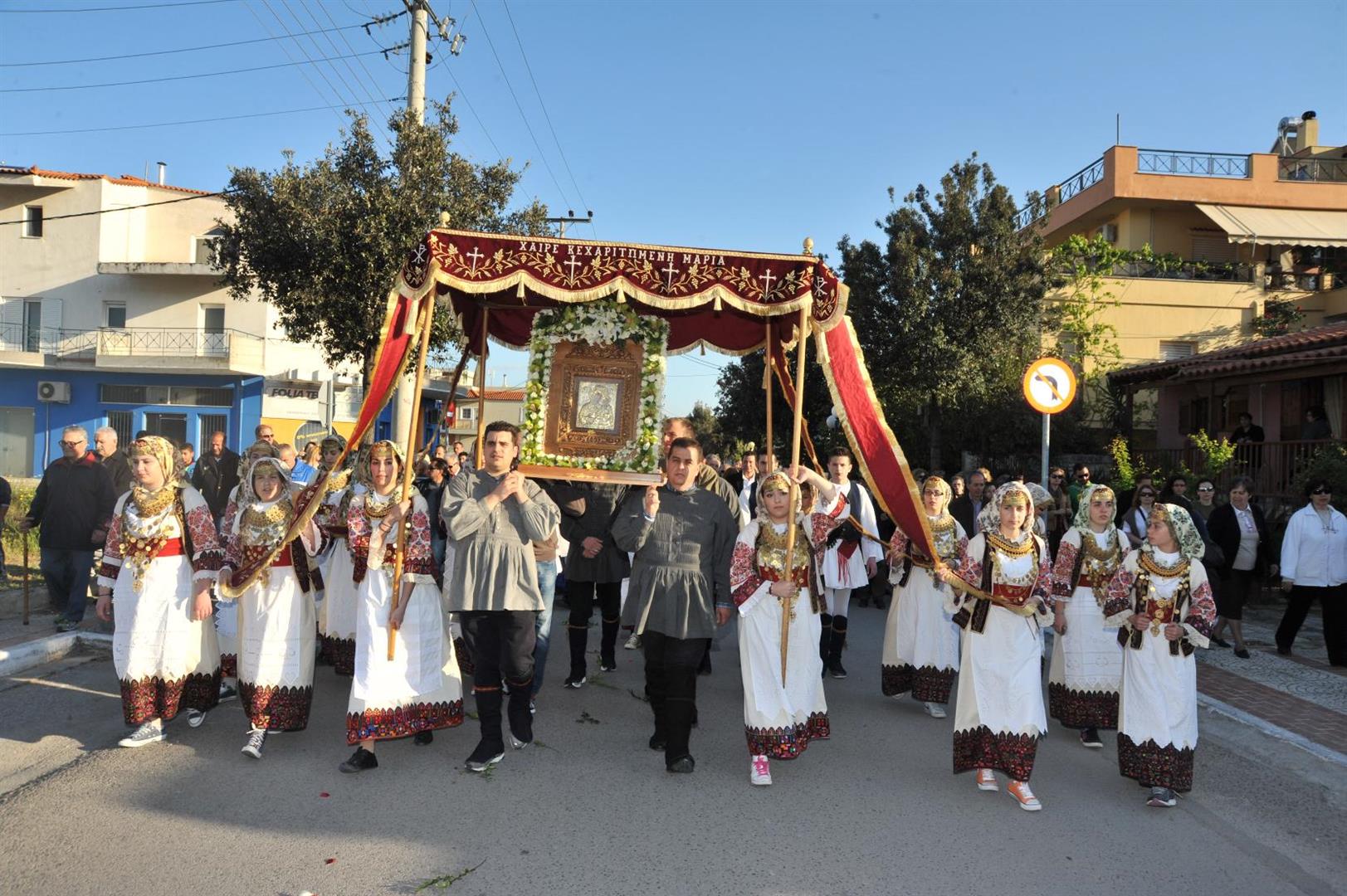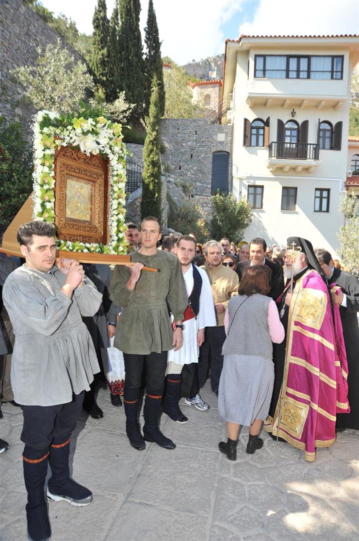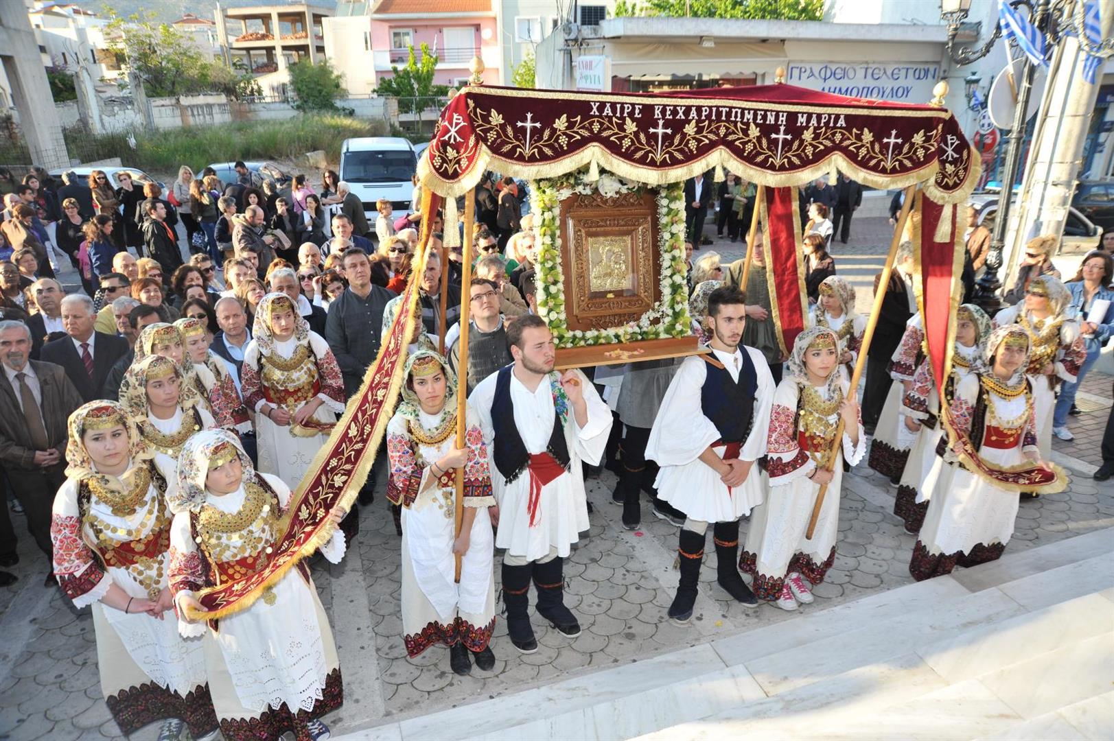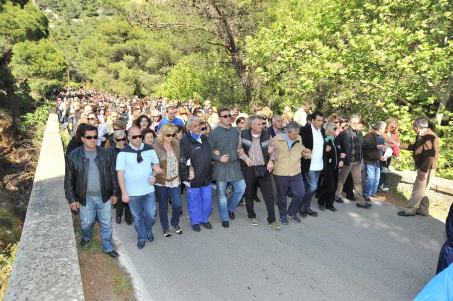 Πολλοί ήταν εκείνοι - άνδρες και γυναίκες - που μετέφεραν την εικόνα στους ώμους τους κατά τη διάρκεια της δίωρης πορείας. Το γιορτινό χρώμα, βεβαίως, έδωσαν τα παιδιά του πολιτιστικού συλλόγου «η Γρίζα» με τις τοπικές ενδυμασίες.