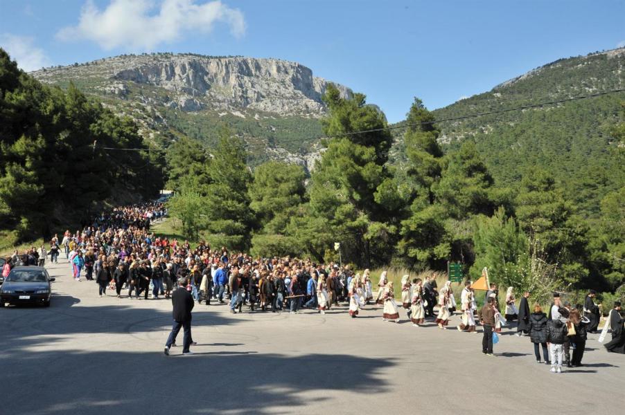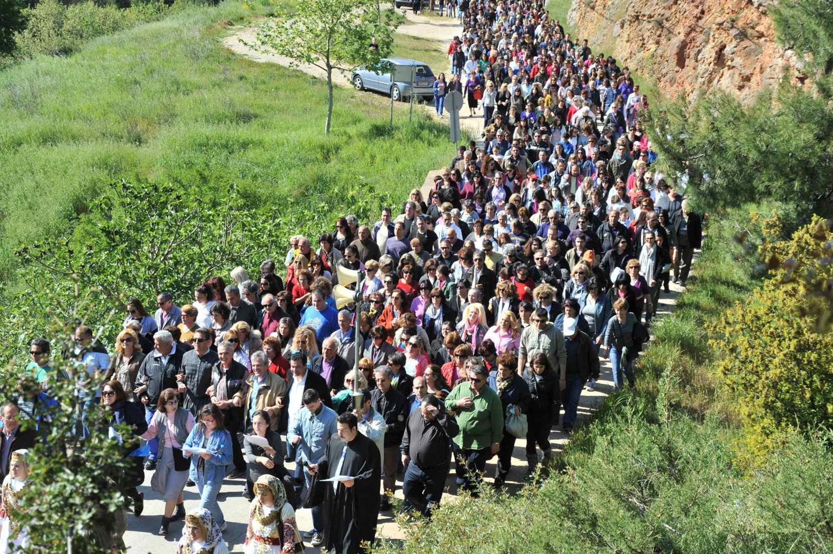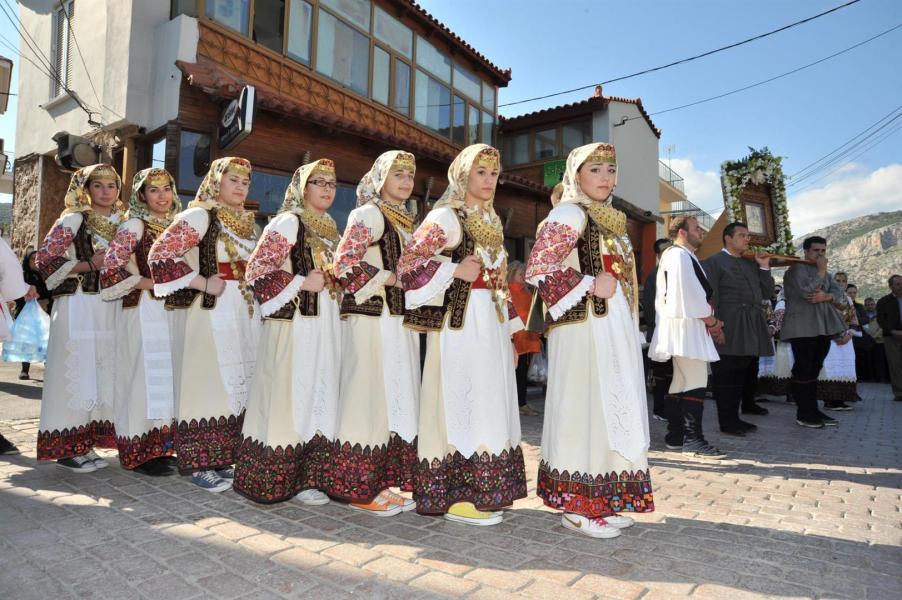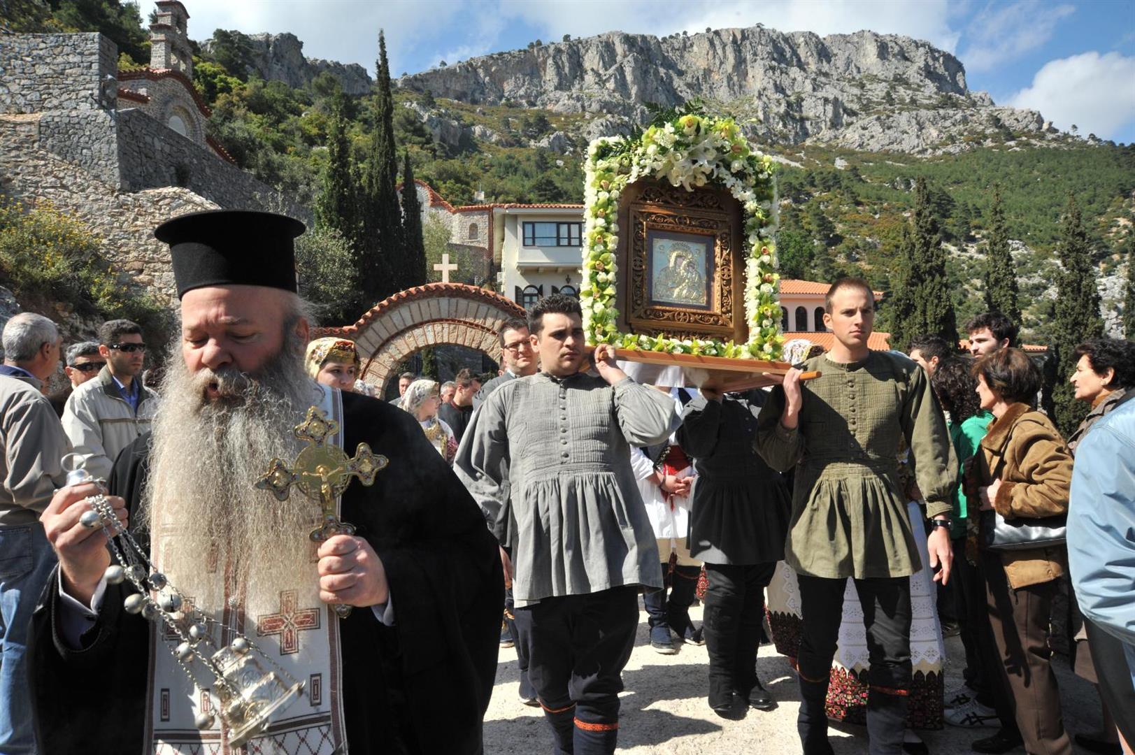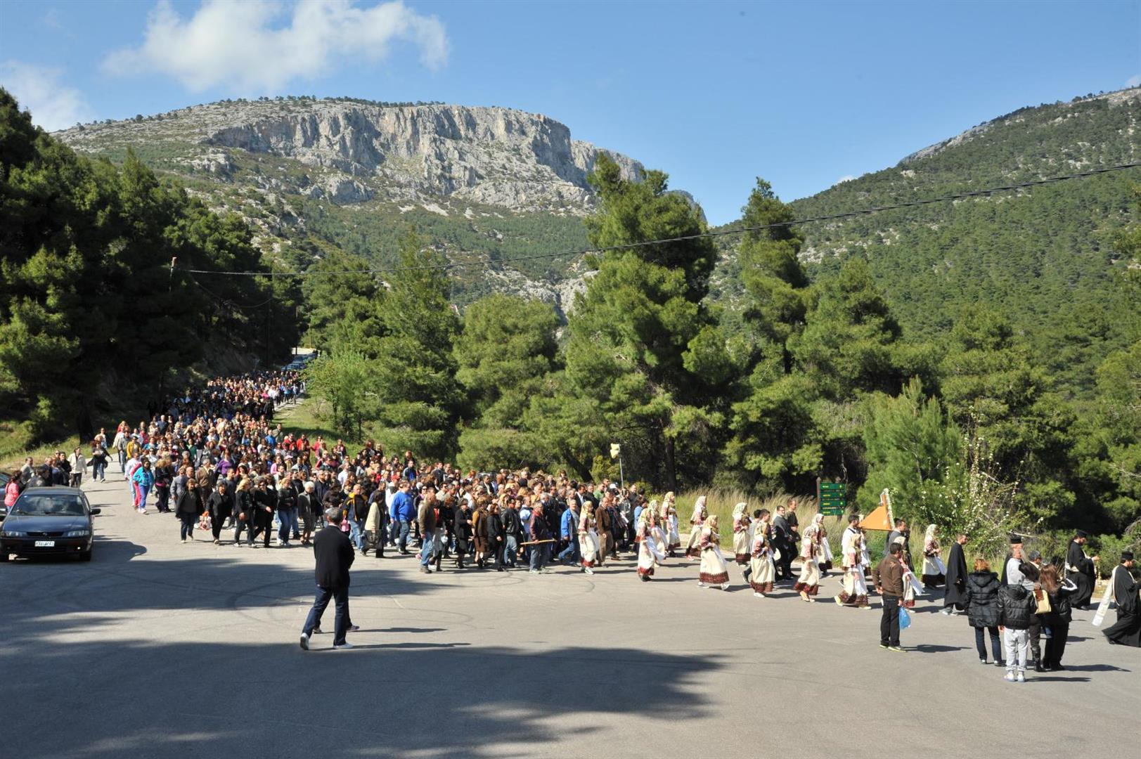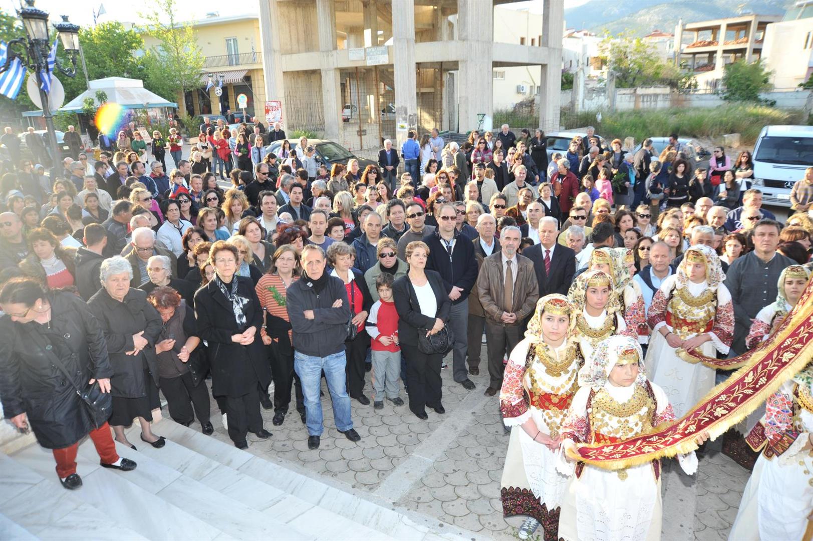 Πολλοί ήταν εκείνοι - άνδρες και γυναίκες - που μετέφεραν την εικόνα στους ώμους τους κατά τη διάρκεια της δίωρης πορείας. Το γιορτινό χρώμα, βεβαίως, έδωσαν τα παιδιά του πολιτιστικού συλλόγου «η Γρίζα» με τις τοπικές ενδυμασίες.
