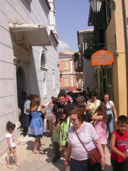 Το μεσημέρι στις 2.30 ήμασταν στο Ναύπλιο και δόθηκε ελεύθερος χρόνος για φαγητό και ξενάγηση στα αξιοθέατα και τα προσκυνήματα του παλαιού Ναυπλίου. Προσκυνήσαμε στους Ιερούς Ναούς: Γενέσιο Θεοτόκου (όπου βρίσκονται Ιερά Λείψανα του Αγίου Αρσενίου του Καππαδόκου), Αγίου Σπυρίδωνος (όπου εκεί δολοφονήθηκε ο πρώτος Κυβερνήτης της Ελλάδος Καποδίστριας) και επισκεφτήκαμε το φρούριο του Παλαμηδίου, το  οποίο είναι το μεγαλύτερο και καλύτερα διατηρημένο φρουριακό συγκρότημα της Ενετικής Εποχής στην Ελλάδα. Βρίσκεται επάνω στον ομώνυμο λόφο σε ύψος 216μ. Ολοκληρώθηκε το 1714 σε εντυπωσιακό χρόνο μόλις λίγων ετών για να εξυπηρετήσει τις ανάγκες των βενετσιάνικων στρατιωτικών δυνάμεων εκείνης της εποχής. Ακολουθεί τη φυσική γραμμή του λόφου και γίνεται ένα με το τοπίο γύρω του, απόλυτα σεβόμενο το χώρο αλλά και το σκοπό που είχε αναλάβει να εξυπηρετήσει.
