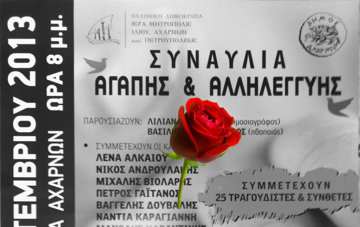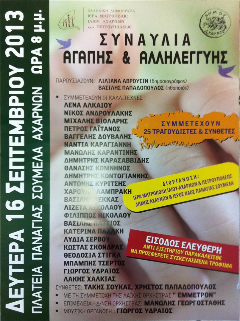Στις 16 Σεπτεμβρίου 2013 στις 8 μ.μ., είμαστε όλοι προσκεκλημένοι στη μεγάλη συναυλία αγάπης και αλληλεγγύης που συνδιοργανώνουν η Ιερά Μητρόπολις Ιλίου, ο Δήμος Αχαρνών και ο Ιερός Ναός Παναγίας Σουμελά Αχαρνών.