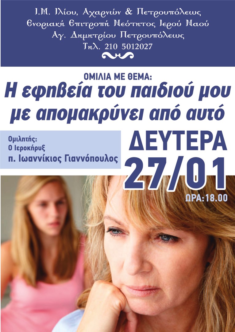 Η ενοριακή επιτροπή νεότητας του Ιερού Ναού Αγίου Δημητρίου Πετρουπόλεως σας προσκαλεί σε ομιλία στο πλαίσιο της σχολής γονέων της ενορίας με θέμα: