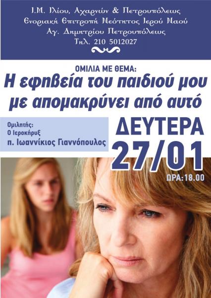 Η ομιλία θα πραγματοποιηθεί τη Δευτέρα 27 Ιανουαρίου και ώρα 18:00 στον Ιερό Ναό του Αγίου Δημητρίου. Το θέμα θα αναπτύξει ο π. Ιωαννίκιος Γιαννόπουλος, ιεροκήρυκας και υπεύθυνος του γραφείου νεότητας της Ιεράς Μητροπόλεως Ιλίου, Αχαρνών και Πετρουπόλεως.