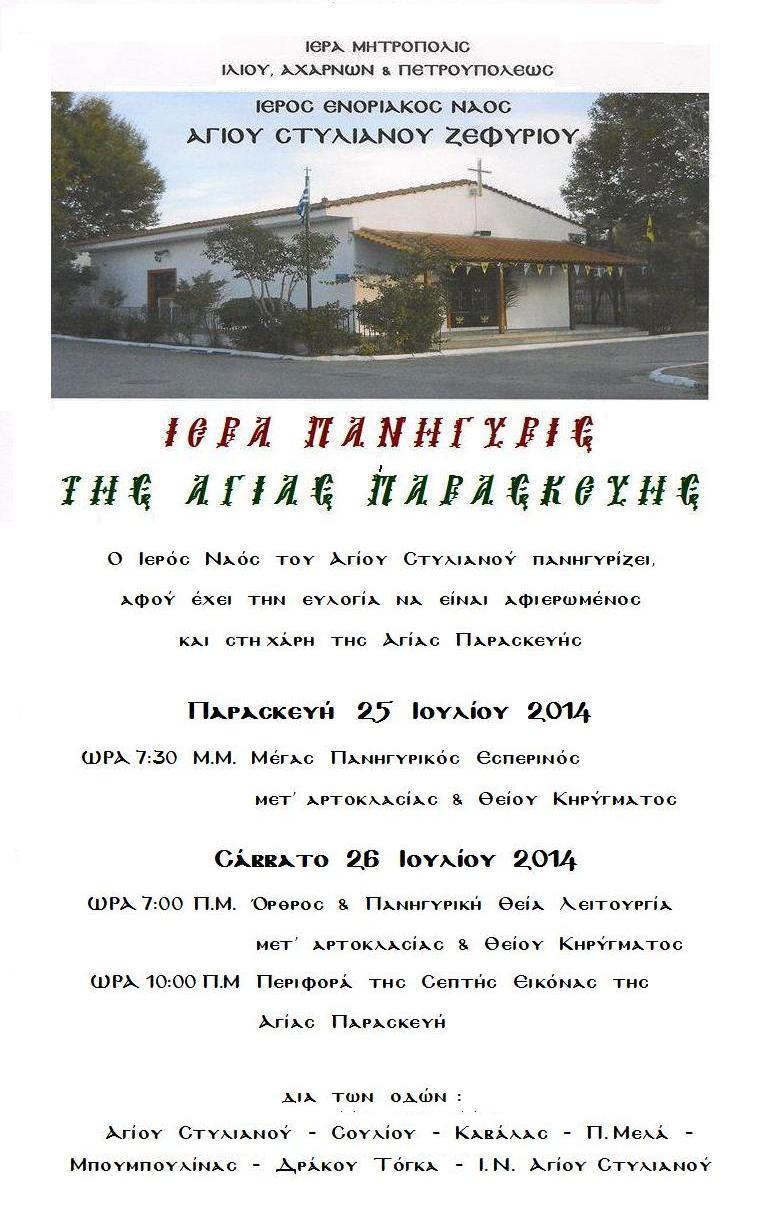 Ο Ι.Ν. Αγ. Στυλιανού Ζεφυρίου είναι αφιερωμένος και στην Αγία Παρασκευή.