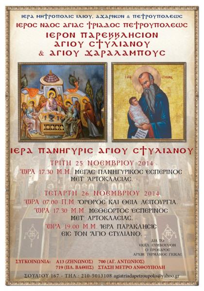 Στις 26 Νοεμβρίου 2014 πανηγυρίζει το παρεκκλήσιο των Αγίων Στυλιανού και Χαραλάμπους που βρίσκεται στον Ι.Ν. Αγ. Τριάδος Πετρουπόλεως.