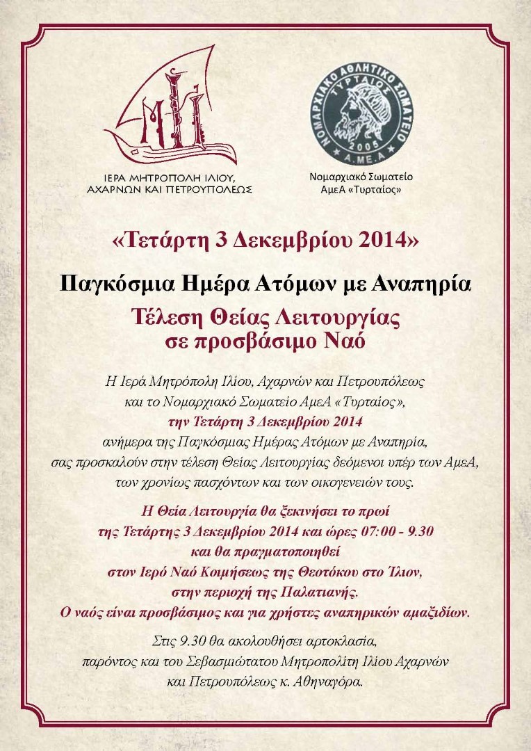 Η Ιερά Μητρόπολη Ιλίου, Αχαρνών και Πετρουπόλεως και το Νομαρχιακό Σωματείο ΑμεΑ «Τυρταίος» εορτάζουν την παγκόσμια ημέρα ατόμων με αναπηρία.