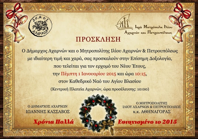 Ο Σεβ. Μητροπολίτης Ιλίου, Αχαρνών και Πετρουπόλεως κ. Αθηναγόρας θα τελέσει την Δοξολογία για την έλευση του νέου έτους στον Ι.Ν. Αγ. Βλασίου Αχαρνών.