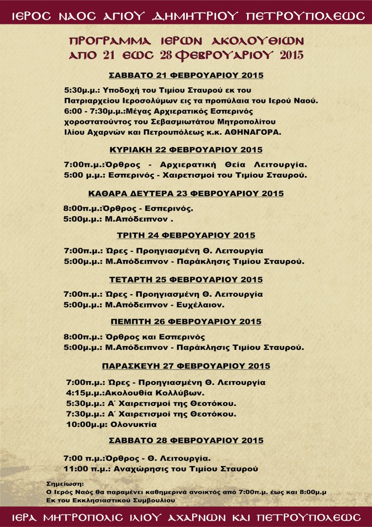 Με ιδιαίτερη χαρά και συγκίνηση η πόλη της Πετρούπολης και ιδιαίτερα ο Ι.Ν. Αγίου Δημητρίου Πετρουπόλεως, υποδέχθηκαν σήμερα Σάββατο 21 Φεβρουαρίου 2015, τεμάχιο Τιμίου Ξύλου από το Πατριαρχείο Ιεροσολύμων, το οποίο εκόμισε ο π. Χαράλαμπος, εντεταλμένος του Πατριαρχείου Ιεροσολύμων για την μεταφορά κειμηλίων. Η υποδοχή έγινε από τον Σεβασμιώτατο Μητροπολίτη Ιλίου, Αχαρνών και Πετρουπόλεως κ. Αθηναγόρα.
