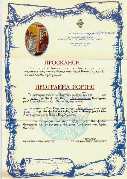 -Μέγας Εσπερινός, χοροστατούντος του Σεβ. Μητροπολίτη Ιλίου κ. Αθηναγόρου, 24/3/2015, ώρα 18:30. -Όρθρος και Θ. Λειτουργία, 25/3/2015, ώρα 07:00. -Λιτάνευση της Εικόνας, 25/3/2015, ώρα 16:30.