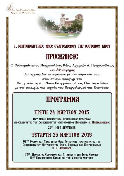 Σήμερα 24η και αύριο 25η Μαρτίου 2015, πανηγυρίζει ο Ιερός Μητροπολιτικός Ναός Ευαγγελισμού της Θεοτόκου Ιλίου, σύμφωνα με το συνημμένο πρόγραμμα.