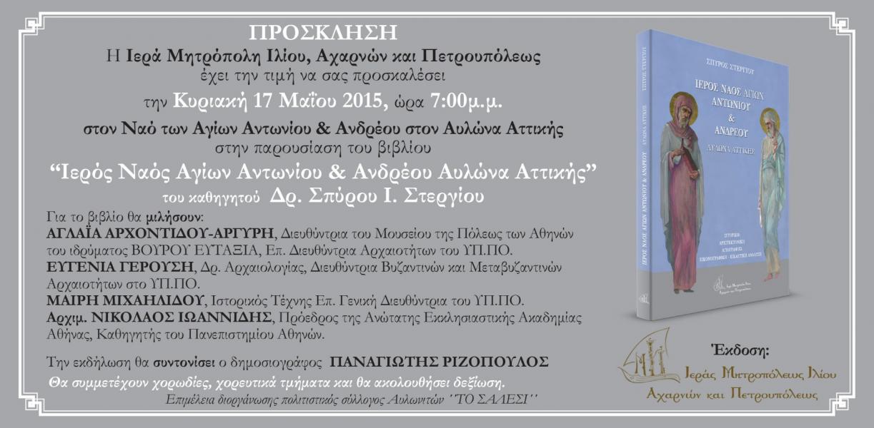 Δεύτερη παρουσίαση του βιβλίου που εξέδωσε η Ι.Μ. Ιλίου για τον ιστορικό Ιερό Ναό Αγ. Αντωνίου και Ανδρέου Αυλώνα, η οποία θα γίνει στο φυσικό του χώρο.
