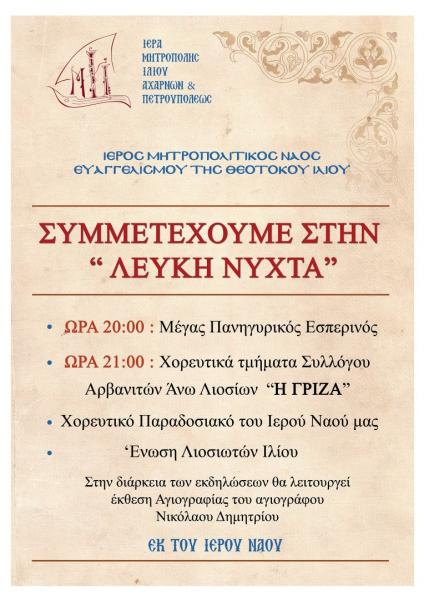 Με λατρευτικές και πολιτιστικές εκδηλώσεις συμμετέχει ο Ιερός Μητροπολιτικός Ναός Ευαγγελισμού της Θεοτόκου Ιλίου στη «Λευκή νύχτα» που διοργανώνει ο Δήμος Ιλίου, το Σάββατο 27 Ιουνίου 2015.