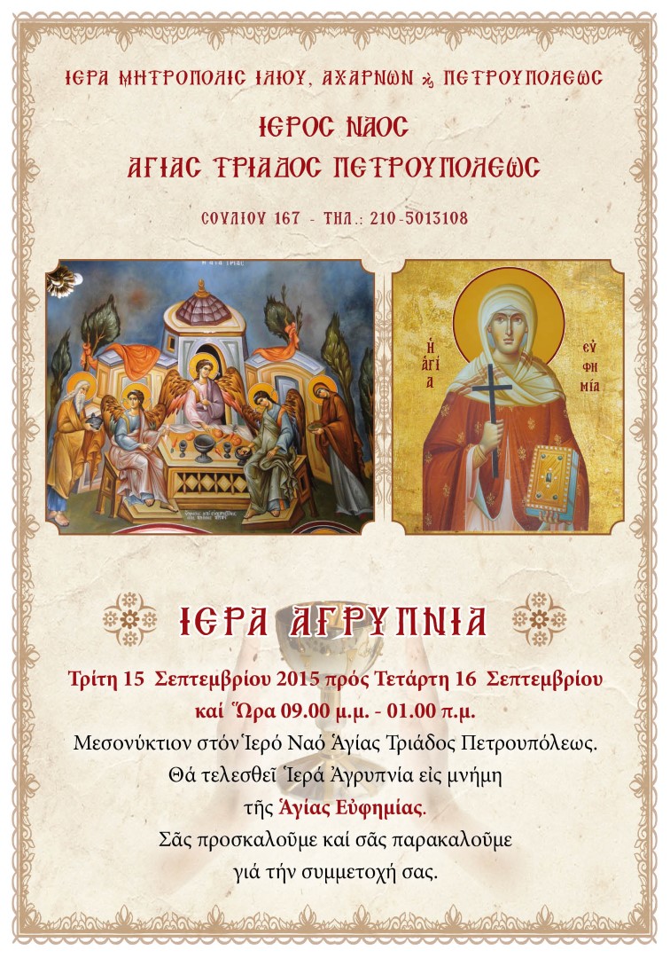 Αγρυπνία στη μνήμη της Αγίας Ευφημίας θα τελεστεί στον Ι.Ν. Αγ. Τριάδας Πετρουπόλεως.