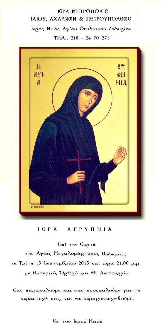 Αγρυπνία στη μνήμη της Αγίας Ευφημίας θα τελεστεί στον Ι.Ν. Αγ. Στυλιανού Ζεφυρίου.