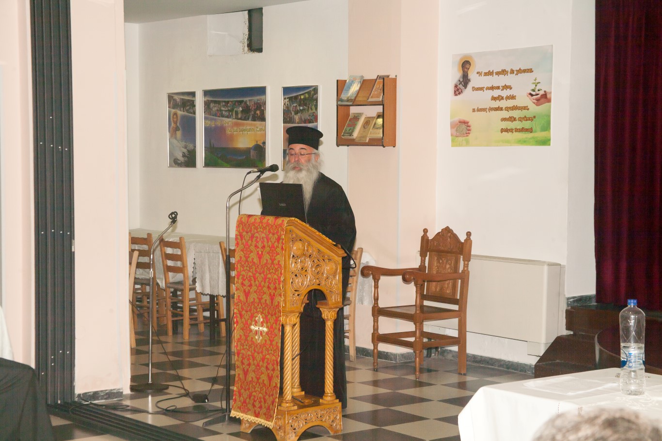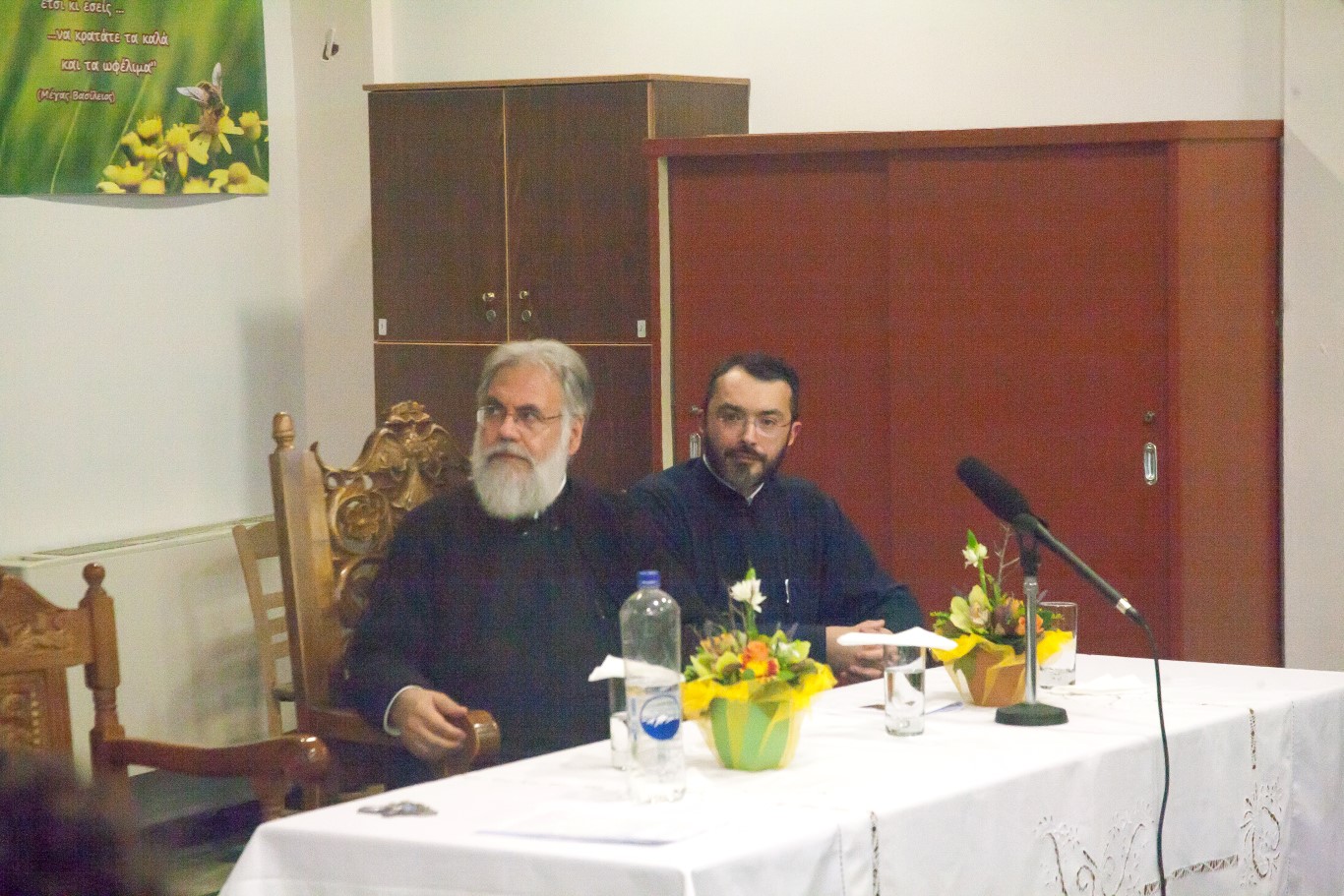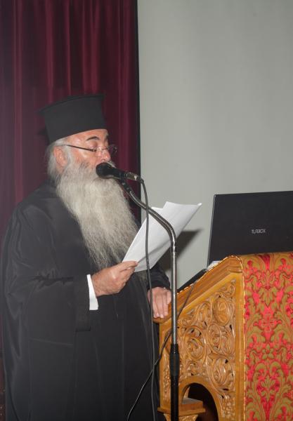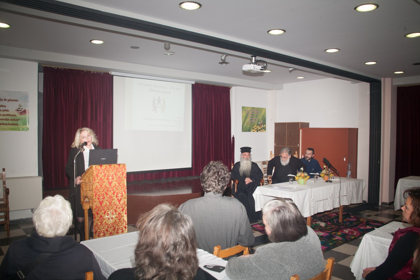 Στην συνέχεια τον λόγο πήρε ο Πρωτοσύγκελλος της Ιεράς Μητροπόλεως π. Γαβριήλ, ο οποίος ως πρώτος ομιλητής ανέπτυξε το θέμα «Εκκλησία και Εθελοντισμός». Ο. π. Γαβριήλ ανέφερε πώς ο εθελοντισμός δίνει νόημα και περιεχόμενο σε πανανθρώπινες αξίες, λιγότερο ή περισσότερο ξεχασμένες, όπως είναι η κοινωνική αλληλεγγύη, η κοινωνική προσφορά και η αγάπη προς τον συνάνθρωπο, καταλήγοντας ότι το συγκεκριμένο Εκπαιδευτικό Πρόγραμμα στόχο έχει την εφαρμογή όλων των χριστιανικών αξιών στον καρκινοπαθή που υποφέρει και αναζητά μέσα από την συμπαράστασή μας την κατάκτηση της ελπίδας.