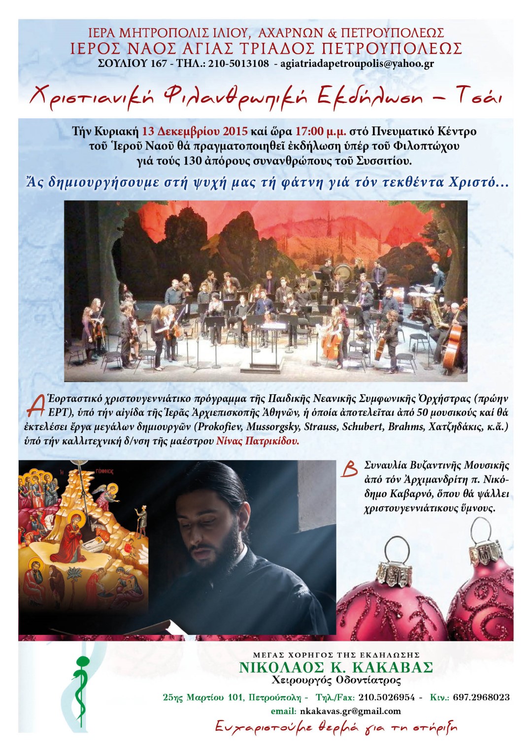 Χριστουγεννιάτικη φιλανθρωπική εκδήλωση, για την ενίσχυση του σισιτίου των 130 απόρων συνανθρώπων μας, διοργανώνει το Ταμείο Ενοριακής Δράσης του Ι.Ν. Αγ. Τριάδας Πετρουπόλεως.