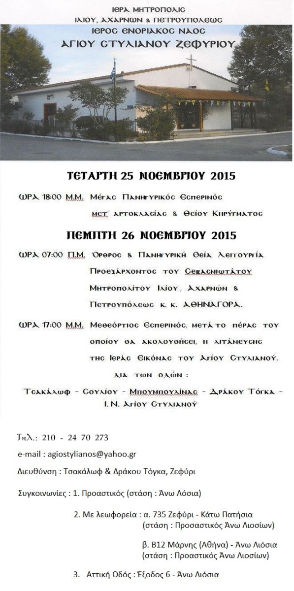 Στις 25 και 26 Νοεμβρίου 2015 πανηγυρίζει ο Ι. Ν. Αγ. Στυλιανού Ζεφυρίου σύμφωνα με το πρόγραμμα που ακολουθεί.
