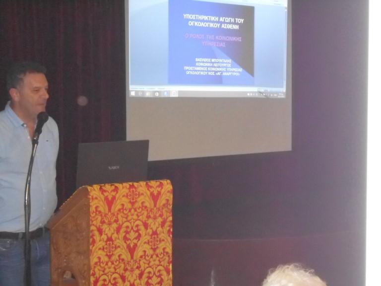 Ο κύριος Μπούνταλης παρουσίασε τον ρόλο και της σημασία της Κοινωνικής Υπηρεσίας του Ογκολογικού Νοσοκομείου στην φροντίδα του ογκολογικού ασθενούς τονίζοντας, ότι ο κοινωνικός λειτουργός μέσω της υποστηρικτικής θεραπείας στοχεύει στην συναισθηματική εκφόρτιση του ασθενή και στην κατανόηση και επεξεργασία των συναισθημάτων αυτών. Η παραδοχή ότι υπάρχει η ασθένεια, η ερμηνεία και η επεξήγησή της, είναι απαραίτητη με στόχο την ρεαλιστική αντιμετώπισή της, και των επιπτώσεων της στην καθημερινή ζωή του ατόμου. Ο κ. Μπούνταλης ανέφερε επίσης ότι ο κοινωνικός λειτουργός, προσεγγίζει και βοηθά τον άρρωστο και το περιβάλλον του με διάλογο, με παρεμβάσεις ενίσχυσης της αυτοεκτίμησης και γενικότερης ψυχοκοινωνικής στήριξης. Γενικά, αντιμετωπίζει τον ασθενή σαν βιοψυχοκοινωνική οντότητα υπό το πρίσμα της ολιστικής προσέγγισης. Για τον λόγο αυτό, όπως ανέφερε ο ομιλητής, η άριστη και ουσιαστική σχέση συνεργασίας του εθελοντή με τον κοινωνικό λειτουργό είναι πάρα πολύ σημαντική, ώστε να ενταχτεί και να προσαρμοστεί ο καρκινοπαθής με επιτυχία στο νοσοκομειακό πλαίσιο, όσο και να δεχτεί ένα θεραπευτικό πρόγραμμα που θα εξασφαλίσει στον ασθενή να αντλήσει ψυχικές δυνάμεις για να δώσει την μάχη του με τον καρκίνο.