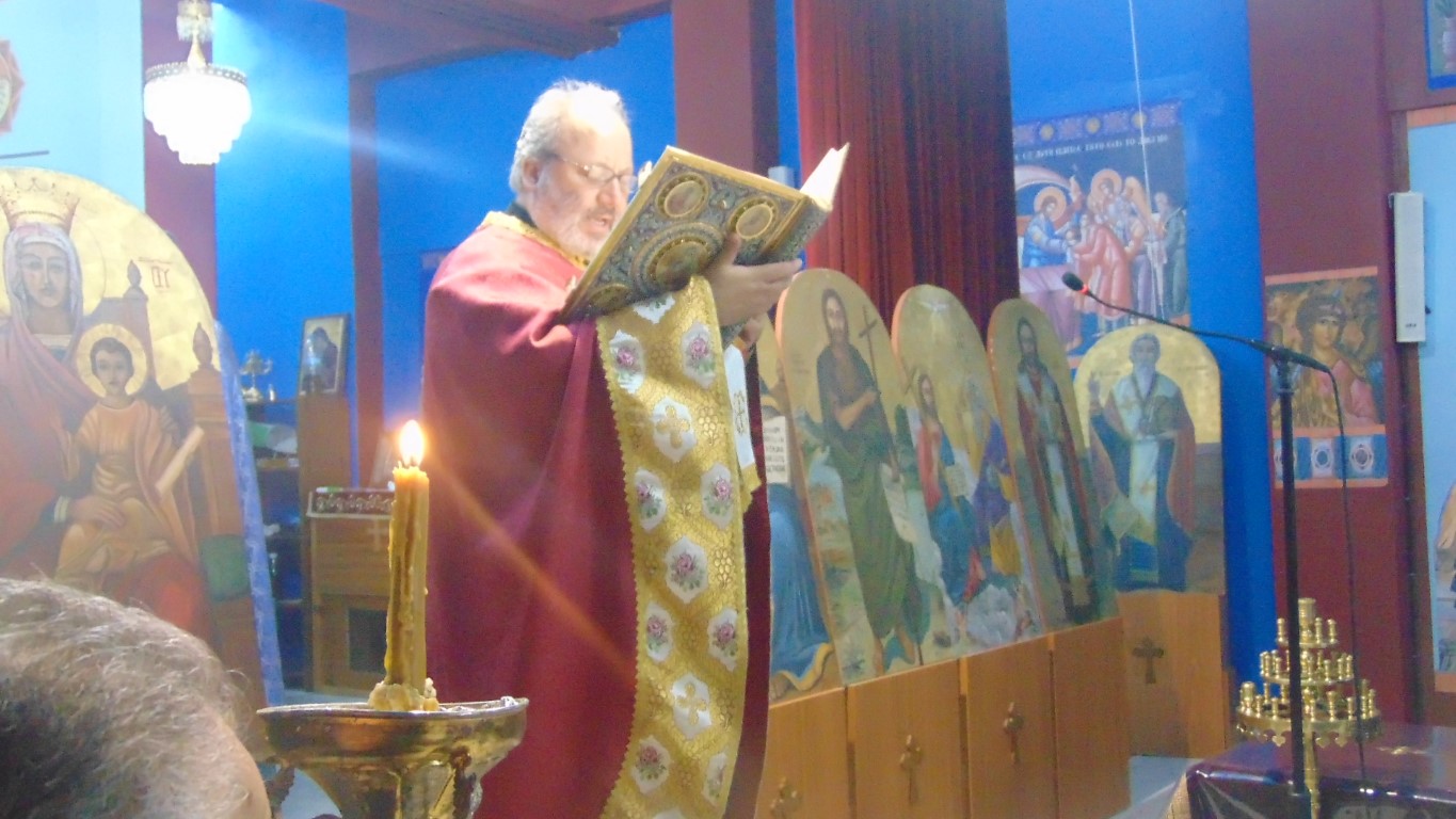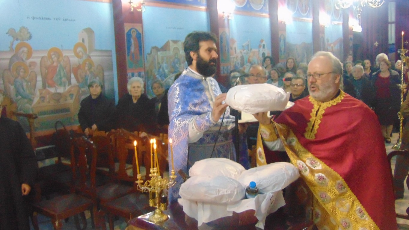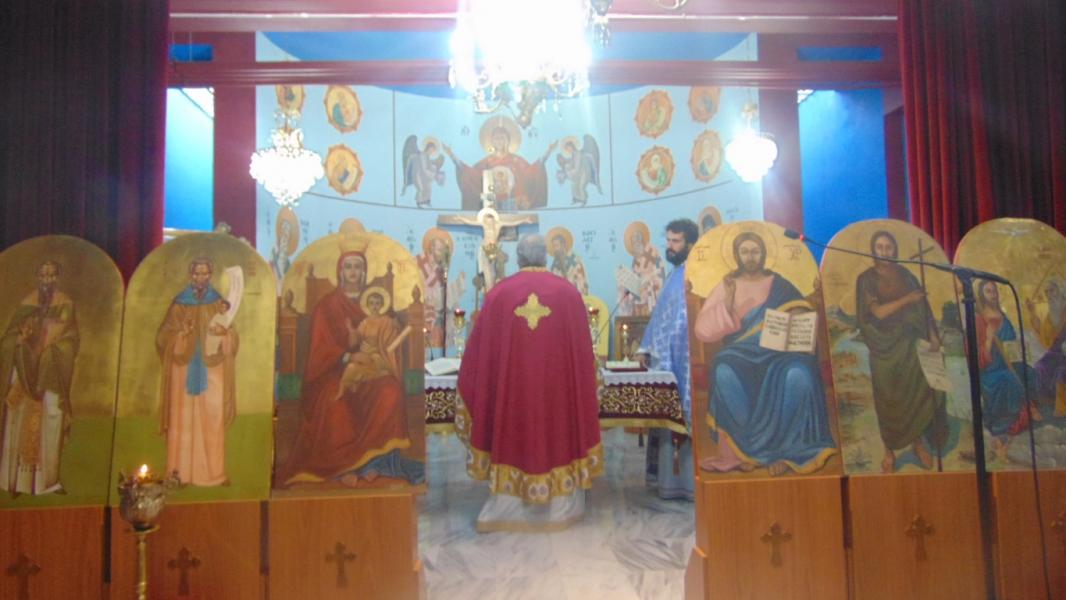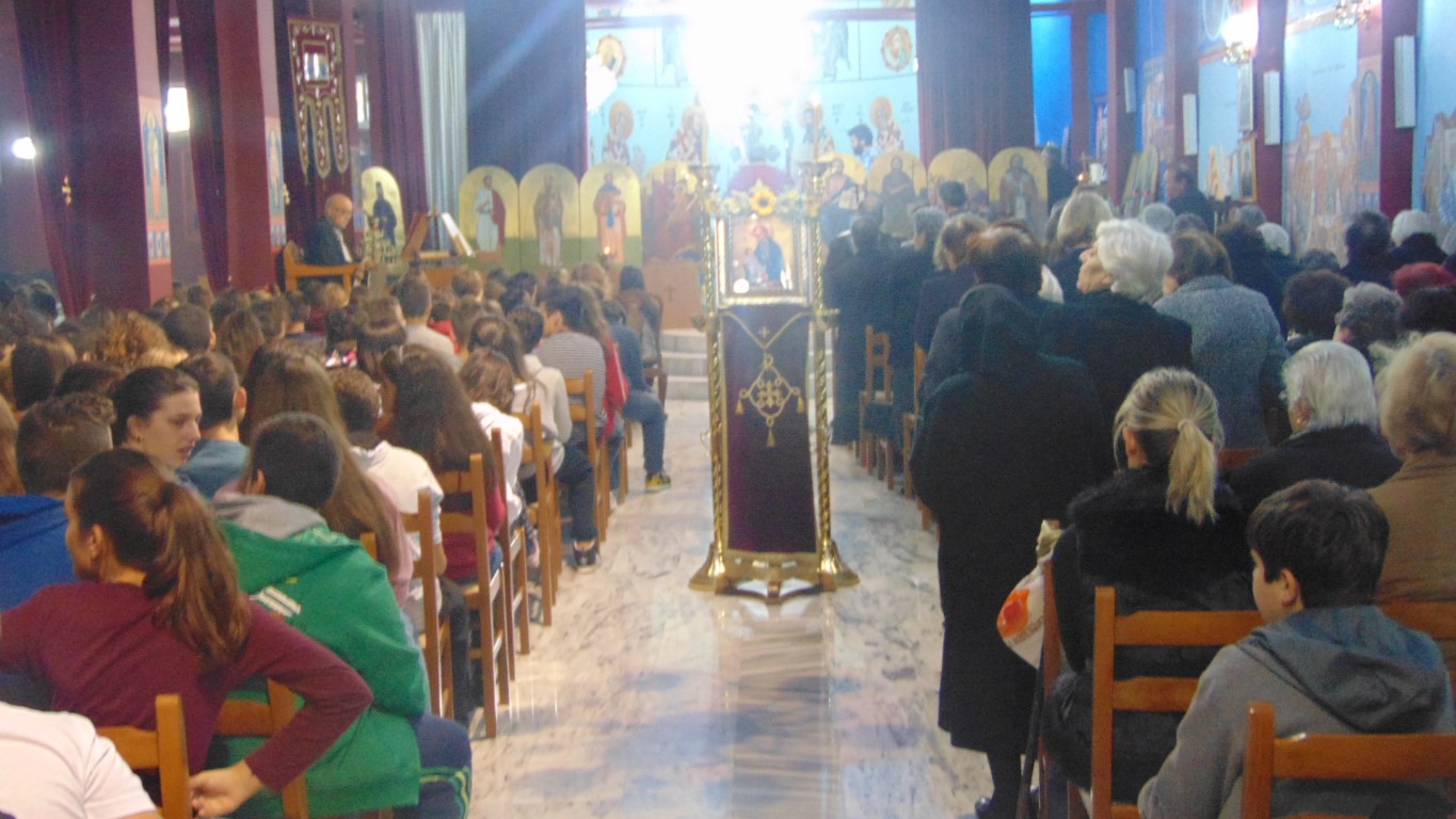Οι ιερείς του ναού τέλεσαν τον Εσπερινό και τον Όρθρο της εορτής του Αγίου, καθώς και τη Θεία Λειτουργία, στην οποία προεξήρχε ο Αρχιμ. Γερμανός Γκίκας και μίλησε επίκαιρα ο π. Σπυρίδων Αργύρης.