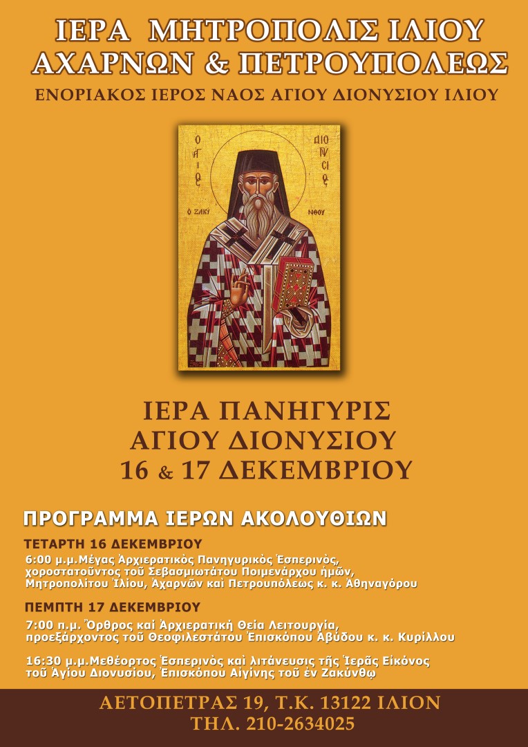 Πανηγυρίζει η ενορία του Αγίου Διονυσίου Ιλίου το διήμερο Τετάρτη και Πέμπτη, 16 και 17 Δεκεμβρίου 2015, σύμφωνα με το ανωτέρω πρόγραμμα.