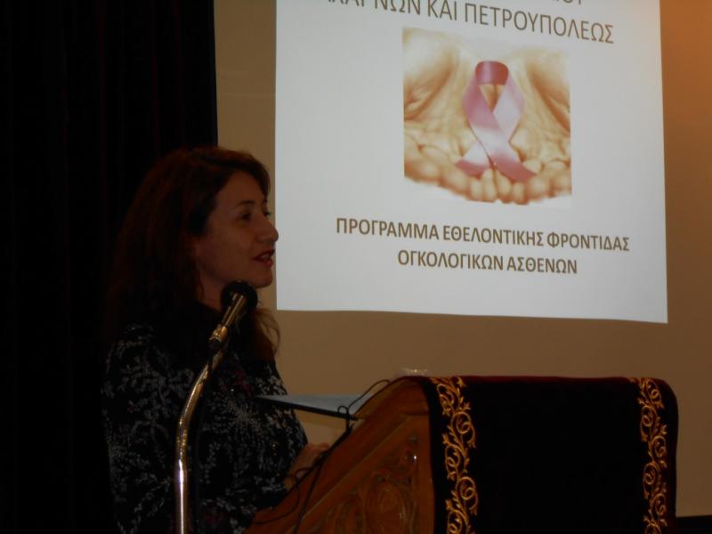 Πρώτη προσκεκλημένη ομιλήτρια ήταν η κ. Βασιλική Παντελή, Ψυχολόγος στην Πανεπιστημιακή Ψυχιατρική κλινική του Γενικού Ογκολογικού Νοσοκομείου Γ.Ο.Ν.Κ. «Οι Άγιοι Ανάργυροι». Η κυρία Παντελή με εξειδικευμένες μεταπτυχιακές σπουδές στον χώρο της Υγείας, της Νοσηλευτικής και της Ψυχολογίας ανέπτυξε την σημασία των εθελοντικών οργανώσεων και την συνεισφορά τους στο χώρο της υγείας. Η κ. Παντελή παρουσίασε τον ρόλο του Εθελοντισμού στην ογκολογική φροντίδα, αναλύοντας την σημασία που έχει η κατανομή του έργου του εθελοντισμού στην στήριξη και την ενίσχυση του ογκολογικού ασθενούς. Η ομιλήτρια ανέφερε πως ο εθελοντισμός κινείται πάντα σε οργανωμένη βάση και ποτέ ατομικά καταλήγοντας ότι κίνητρο του εθελοντισμού και ιδιαίτερα της εθελοντικής ομάδας στο νοσοκομείο, όπου αναφέρεται ο ογκολογικός ασθενής, πρέπει να είναι η πίστη στον ανθρωπισμό και άμυνά του η ολοκλήρωση της εξελικτικής στου πορείας.