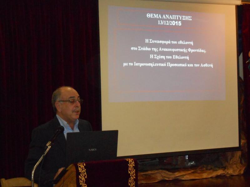 Τρίτος προσκεκλημένος ομιλητής ήταν ο κ. Μιχαήλ Αμάρι, Ιατρός, Διευθυντής ΕΣΥ, Υπεύθυνος Τμήματος Θεραπείας Πόνου και Ανακουφιστικής Φροντίδας, Επιστημονικός Συνεργάτης της ΥΚΟΝ- Γενικού Ογκολογικού Νοσοκομείου Γ.Ο.Ν.Κ. «Οι Άγιοι Ανάργυροι», Υγειονολόγος και Ιατρός Κοινωνικής Εργασίας, με Μεταπτυχιακό στη Σχολή Δημόσιας Υγείας. Ο κ. Αμάρι ανέπτυξε το θέμα «Η συνεισφορά του Εθελοντή στο στάδιο της Ανακουφιστικής φροντίδας. Η σχέση του Εθελοντή με το ιατρονοσηλευτικό προσωπικό και τον ασθενή».