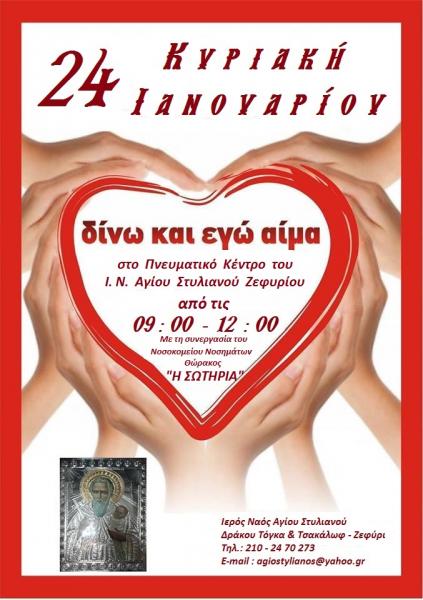 Την Κυριακή 24 Ιανουαρίου 2015 το πρωί, ο Ι.Ν. Αγίου Στυλιανού διοργανώνει εθελοντική αιμοδοσία, σε συνεργασία με το Γενικό Νοσοκομείο Νοσημάτων Θώρακος «Η ΣΩΤΗΡΙΑ».