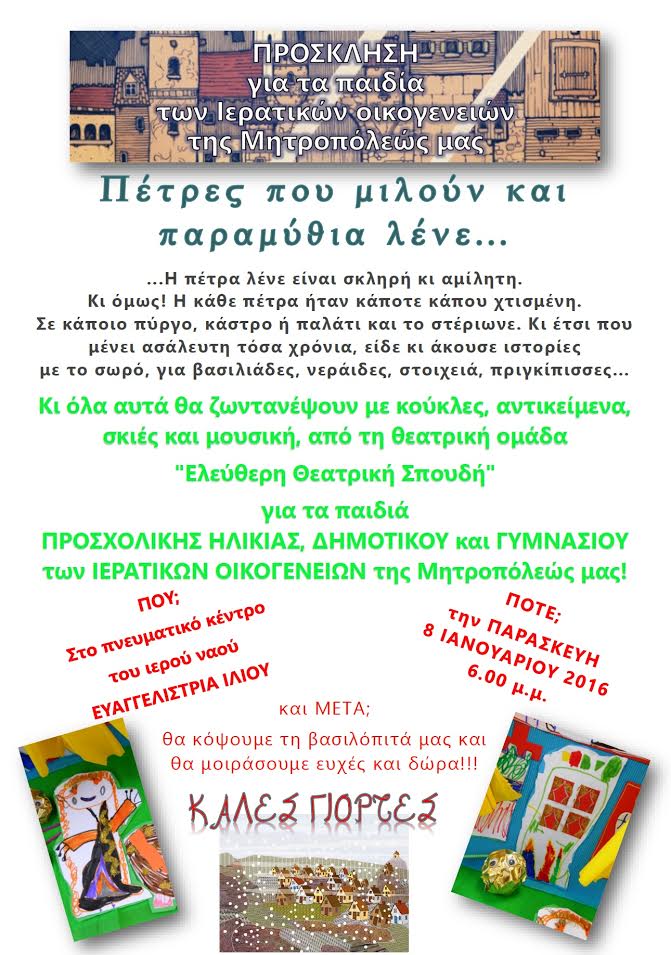 Η γιορτή θα γίνει στο πνευματικό κέντρο του Ι. Μητροπολιτικού Ναού Ευαγγελισμού της Θεοτόκου Ιλίου, την Παρασκευή 8 Ιανουαρίου 2016, στις 6μ.μ.