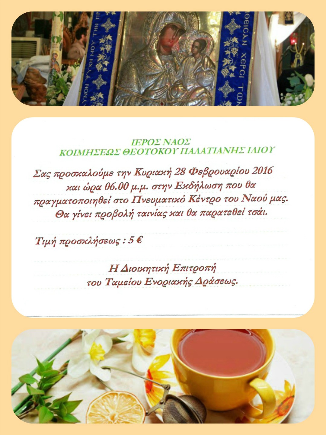 Φιλανθρωπικό τσάι διοργανώνει η ενορία της Παλατιανής του Ιλίου, την Κυριακή 28 Φεβρουαρίου 2016, στις 6 το απόγευμα.