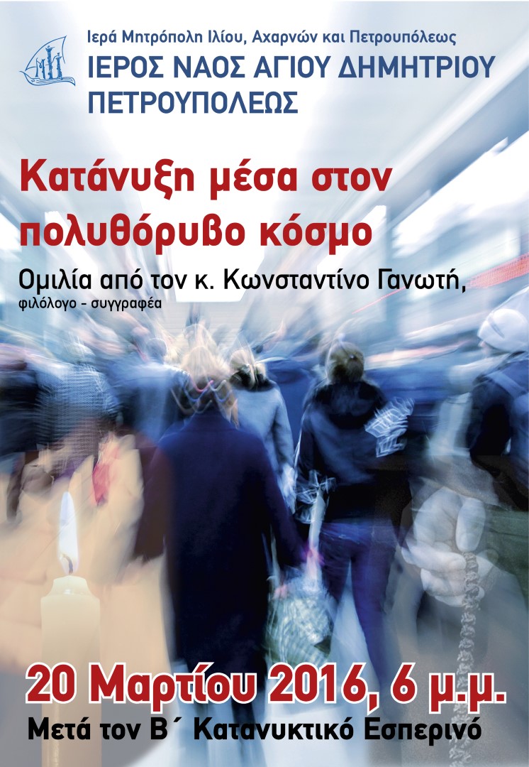 Μετά το τέλος του Εσπερινού θα ακολουθήσει ομιλία, με προσκεκλημένο ομιλητή τον κ. Κωνσταντίνο Γανωτή, φιλόλογο - συγγραφέα, και με θέμα «Κατάνυξη μέσα στον πολυθόρυβο κόσμο».