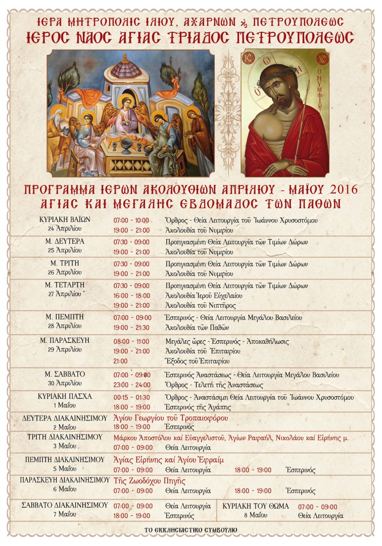 Το πρόγραμμα ακολουθιών του Ι.Ν. Αγ. Τριάδας Πετρουπόλεως για το Πάσχα 2016.