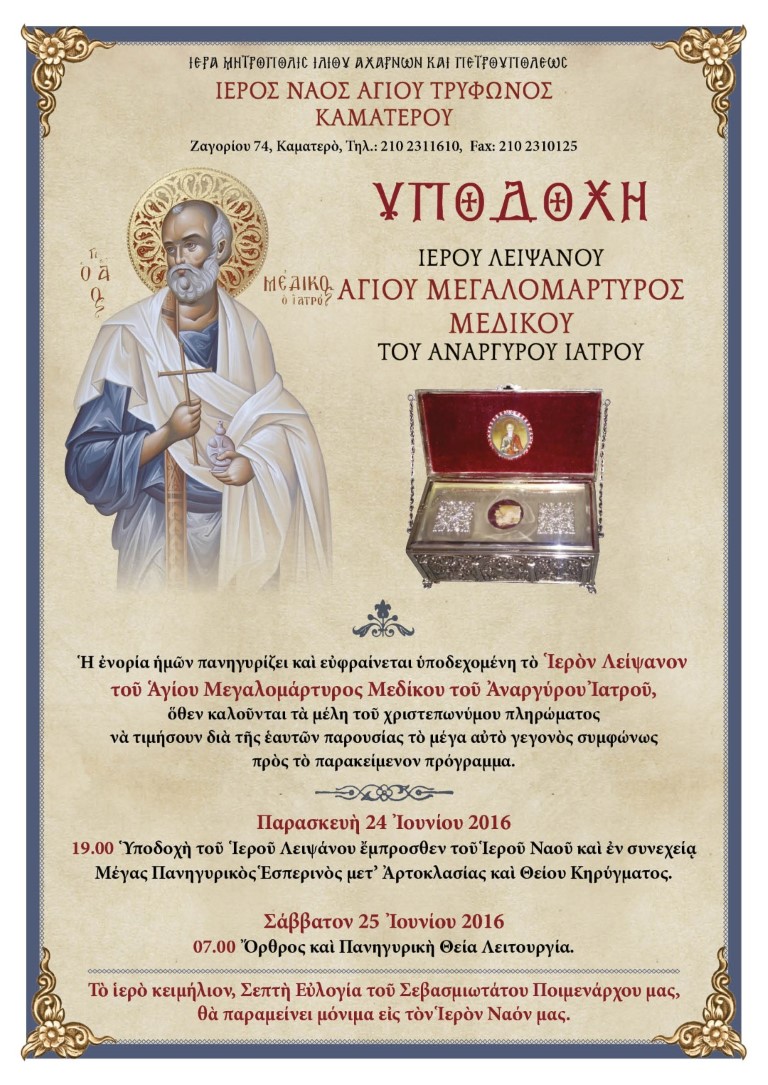 Το ιερό λείψανο του Αγίου Μεδίκου του Αναργύρου ιατρού θα υποδεχθεί η ενορία του Αγ. Τρύφωνα Καματερού, το οποίο θα παραμείνει μονίμως στον Ιερό Ναό.