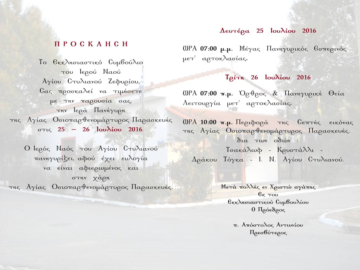 Την πανήγυρη της Αγίας Παρασκευής, στην οποία είναι επίσης αφιερωμένος ο Ιερός Ναός Αγ. Στυλιανού Ζεφυρίου, ανακοινώνει το Εκκλησιαστικό Συμβούλιο της ενορίας. Το πρόγραμμα των ακολουθιών είναι το εξής: