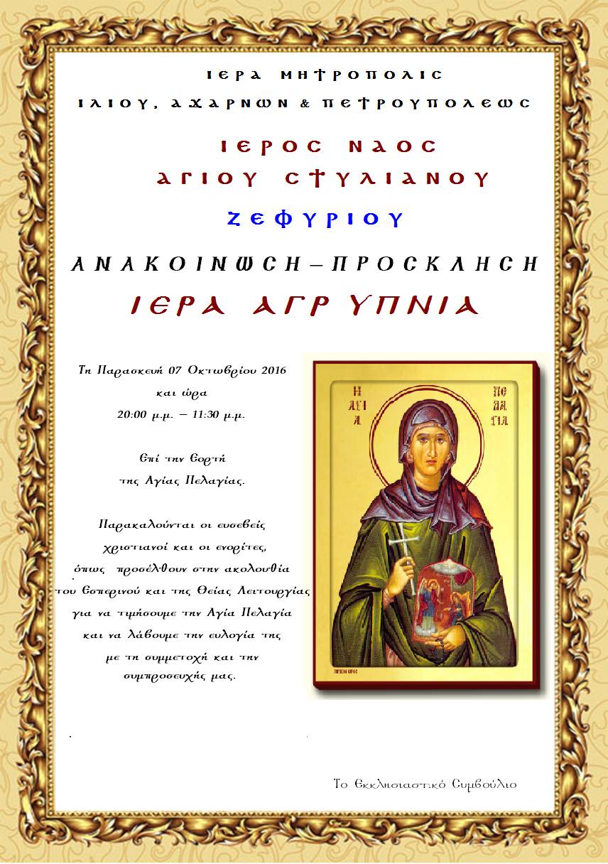 Αγρυπνία θα τελεστεί στον Ι.Ν. Αγ. Στυλιανού Ζεφυρίου επί τη μνήμη της Αγίας Πελαγίας, την Παρασκευή 7 Οκτωβρίου 2016 και ώρα 20:00-23:00.