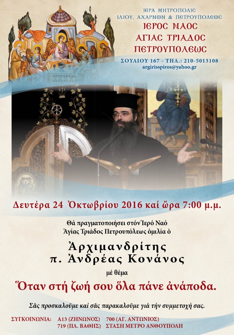 Ομιλία θα πραγματοποιήσει στον Ι.Ν. Αγ. Τριάδας Πετρουπόλεως ο Αρχιμ. Ανδρέας Κονάνος με θέμα: