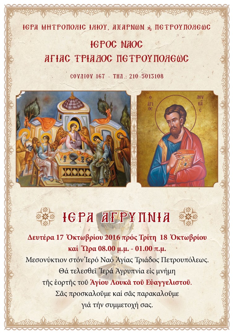 Επί τη μνήμη του Αγίου Λουκά του Ευαγγελιστού θα τελεστεί Ιερά Αγρυπνία στον Ιερό Ναό Αγ. Τριάδας Πετρουπόλεως τη Δευτέρα 17 Οκτωβρίου 2016 στις 8 μ.μ.