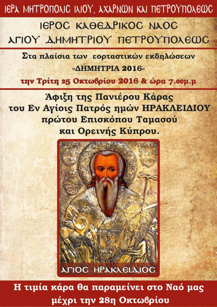 Με εξέχουσα στιγμή την υποδοχή της τιμίας κάρας του Αγ. Ηρακλειδίου, πρώτου Επισκόπου Ταμασού Κύπρου, θα τελεστεί φέτος η πανήγυρις του Ι.Ν. Αγ. Δημητρίου Πετρουπόλεως και τα «Θ' Δημήτρια».