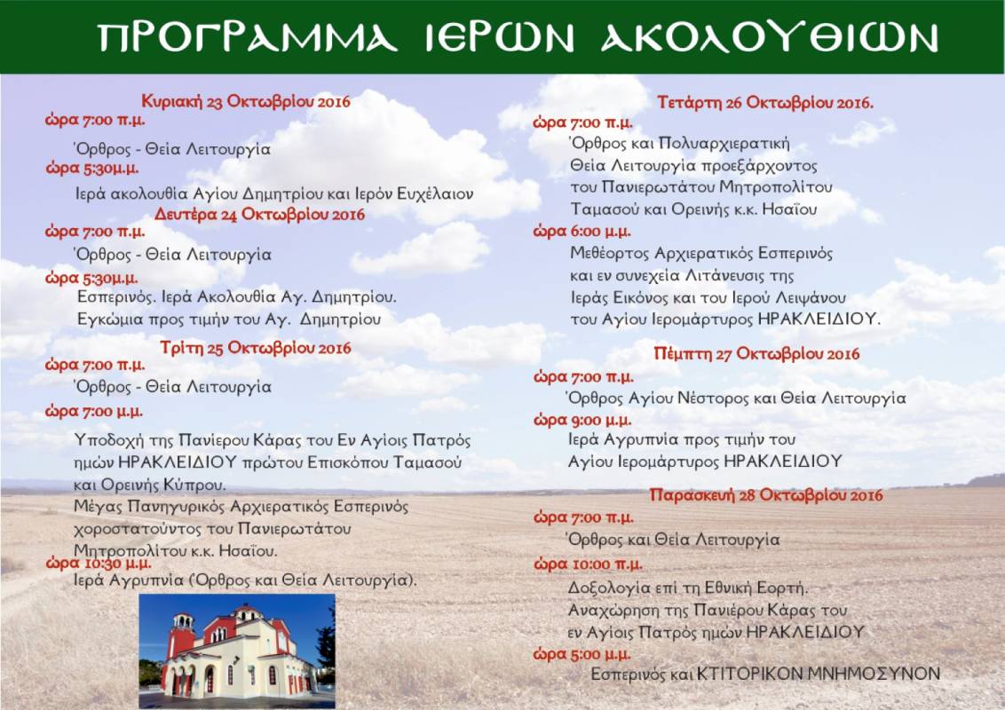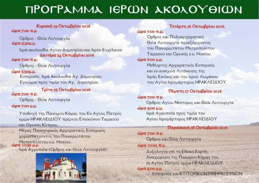 Από την Κυριακή 23 Οκτωβρίου μέχρι και την Παρασκευή 28 Οκτωβρίου 2016, στον πανηγυρίζοντα Ιερό Ναό θα τελεστεί πλήθος ακολουθιών προς τιμήν του Αγίου Δημητρίου, ενώ καθ' όλες τις ημέρες θα εξελίσεται το ιερό προσκύνημα της τιμίας κάρας του Αγίου Ηρακλειδίου.