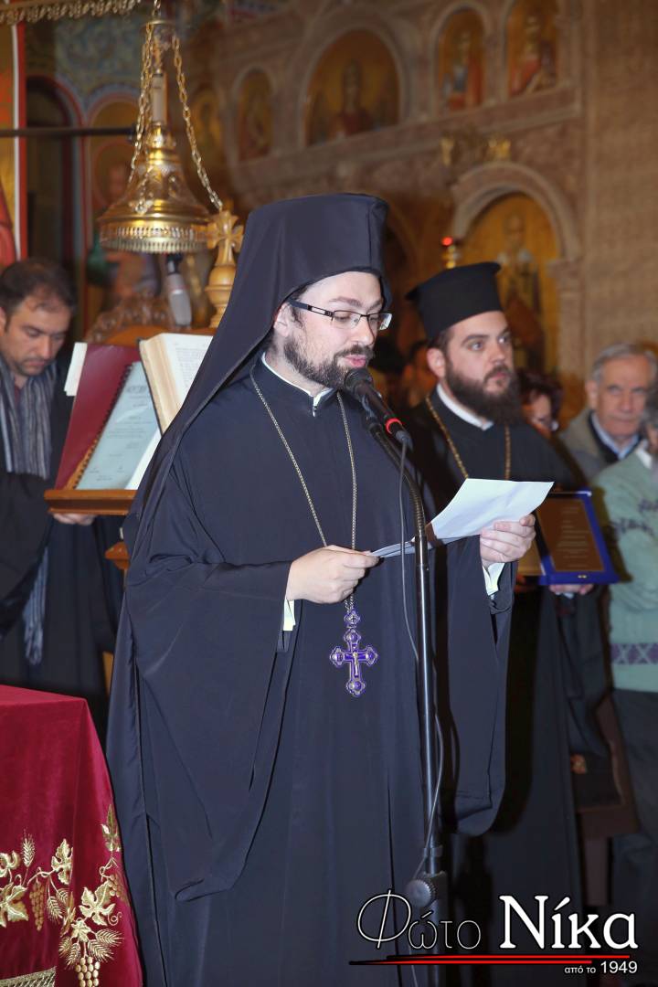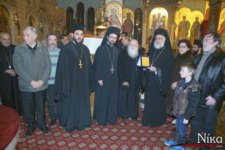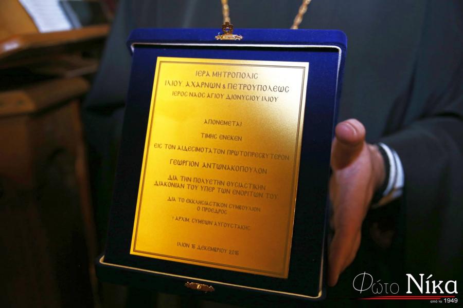 Ο Σεβασμιώτατος Μητροπολίτης Ιλίου, Αχαρνών και Πετρουπόλεως κ. Αθηναγόρας αφού εγκωμίασε τον τιμηθέντα π. Γεώργιο Αντωνακόπουλο ως έναν άξιο Λειτουργό του Υψίστου έχοντας πρότυπο τον εορτάζοντα Άγιο Διονύσιο, έδωσε το λόγο στον Ιερατικό Προϊστάμενο του Ιερού Ναού π. Συμεών Αυγουστάκη. Εκείνος από την πλευρά του εξιστόρησε εν συντομία την ιστορία του Ιερού Ναού τονίζοντας την μεγάλη συνεισφορά για την οικοδόμηση του Ιερού Ναού και για το μεγάλο ποιμαντικό έργο του π. Γεωργίου Αντωνακόπουλου, παρακαλώντας το Σεβασμιώτατο  Μητροπολίτη Ιλίου, Αχαρνών και Πετρουπόλεως κ. Αθηναγόρα όπως του αποδώσει τιμητική πλακέτα «Τιμής Ένεκεν» εκ μέρους του συνεφημερίου του π. Παναγιώτη Γόγολα, του Εκκλησιαστικού Συμβουλίου και όλης της Ενορίας.
