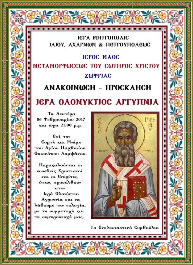 Ολονύκτια αγρυπνία επί τη μνήμη του Αγίου Παρθενίου Επισκόπου Λαμψάκου θα τελεστεί στον Ι.Ν. Μεταμορφώσεως Σωτήρος Άνω Λιοσίων (Ζωφριάς).